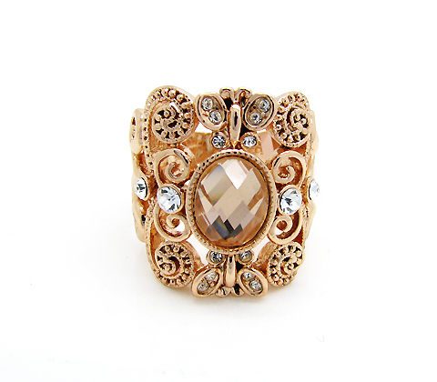Impactante anillo en baño de oro rosa de 18 quilates, con cristal rosado corte oval, detalles en relieve e incrustaciones de cristales blancos. Fabricado en una estructura de aleación de platino con rodio sin níquel.