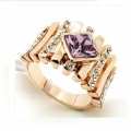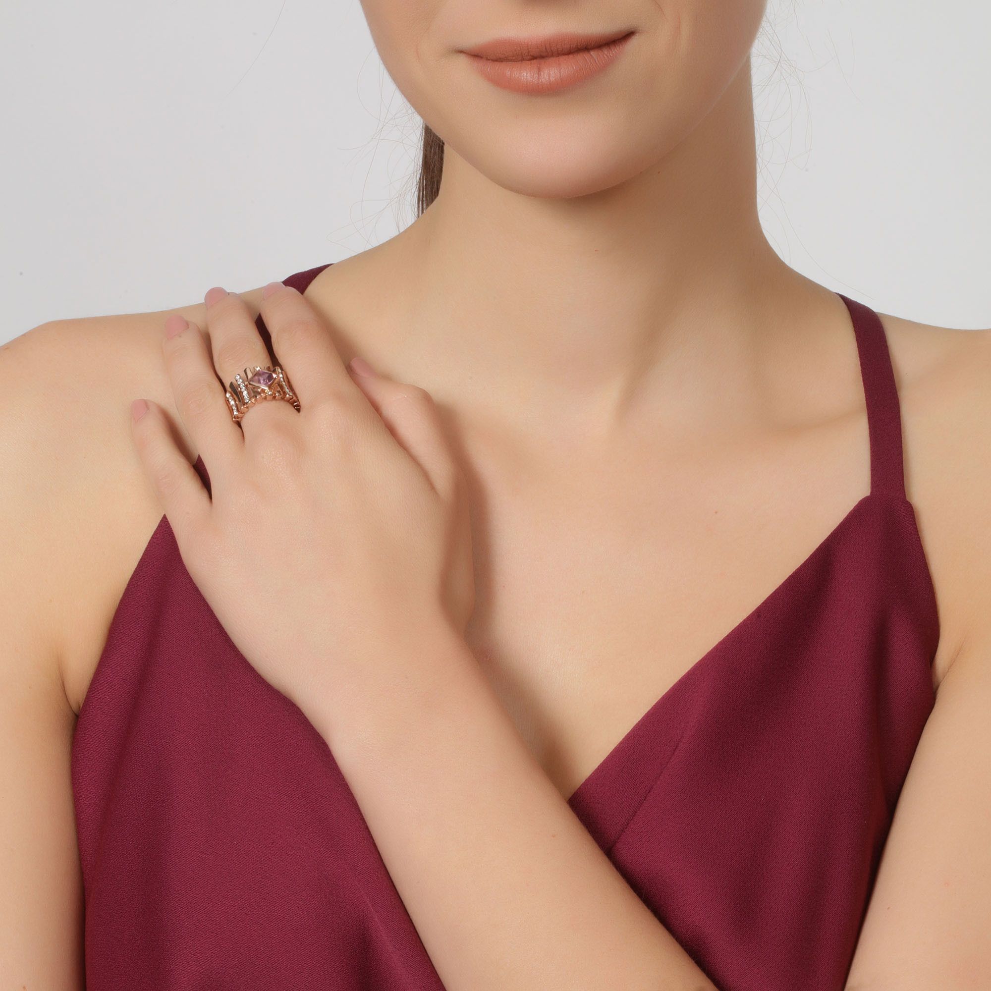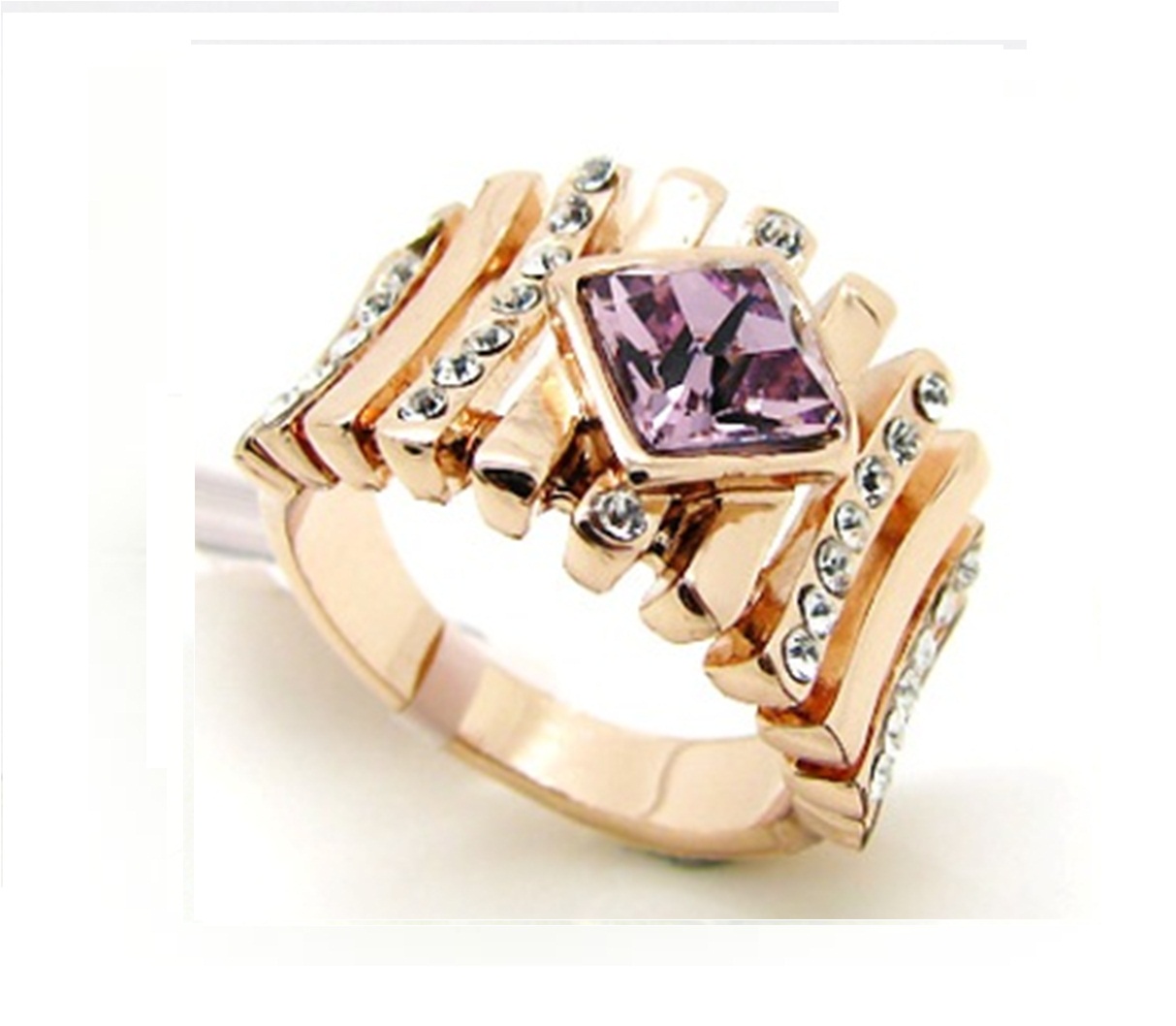 Elegante anillo en baño de oro rosa de 18 quilates, diseño de barras, con cristal violeta corte losange e incrustaciones de cristales blancos. Fabricado en una estructura de aleación de platino con rodio sin níquel.