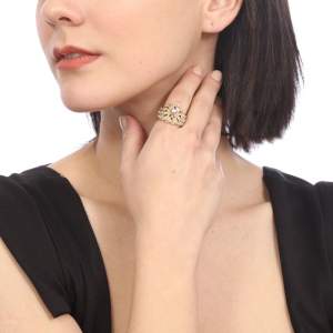 Elegante anillo en baño de oro amarillo de 18 quilates, diseño de curvas, con perlas grises y detalles en relieve. Fabricado en una estructura de aleación de platino con rodio sin níquel.