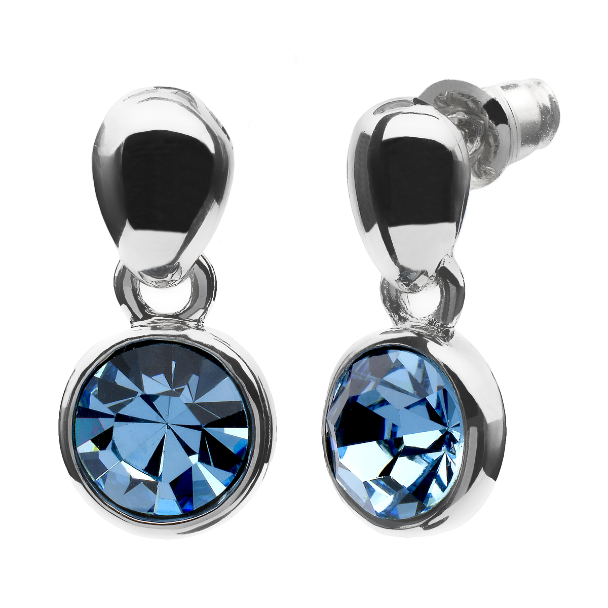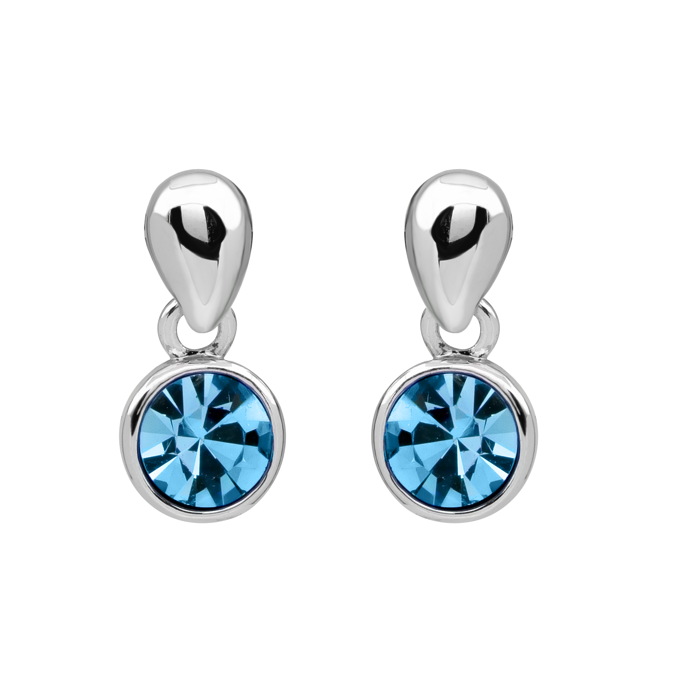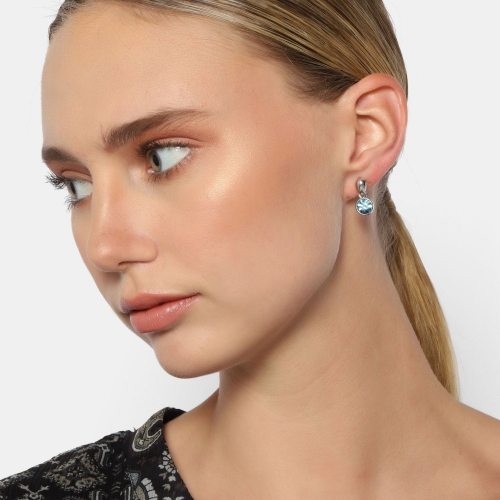 Finos aretes en baño de oro blanco de 18 quilates, diseño de circulo con incrustación de cristal azul corte brillante. Fabricado en una estructura de aleación de platino con rodio sin níquel.
