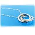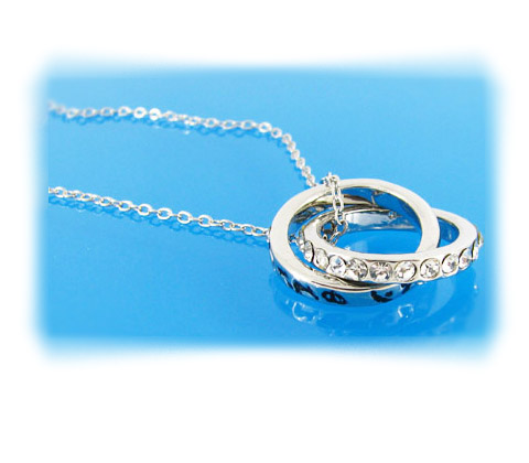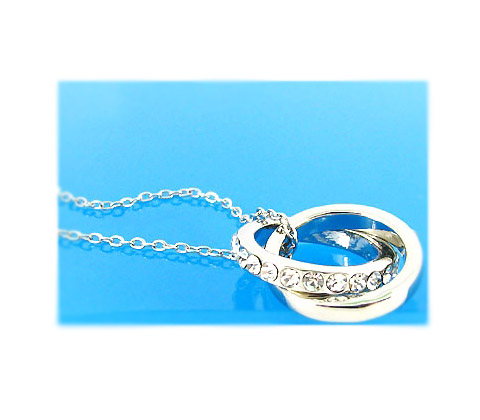 Original dije con cadena en baño de oro blanco de 18 quilates en forma de aros con incrustaciones de cristales blancos. Fabricado en una estructura de aleación de platino con rodio sin níquel.