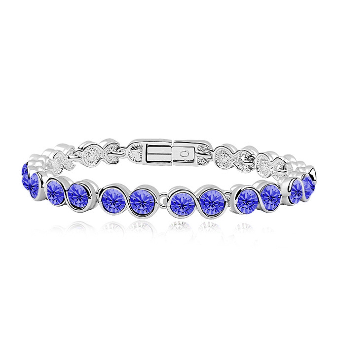Linda pulsera en baño de oro blanco de 18 quilates, diseño de circulos con incrustaciones de cristales en color purpura. Fabricado en una estructura de aleacion de platino con rodio sin niquel. 1. Joyeria Hipo alergenica. 2. Incluye cajita de Joyeria. 3. Garantia de 30 dias por defectos de fabrica.