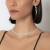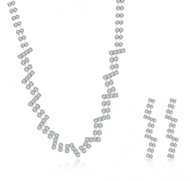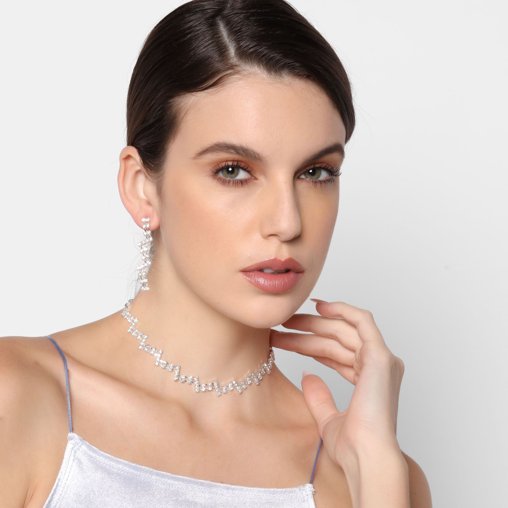 Lindo juego de aretes y collar en baño de oro blanco de 18 quilates, estilo zig-zag, con cristales en color blanco corte brillante. Fabricado en una estructura de aleación de platino con rodio sin níquel.