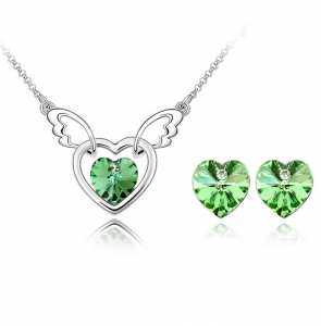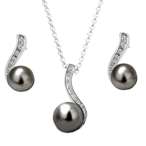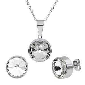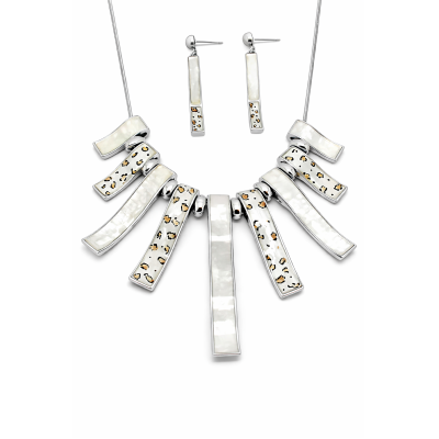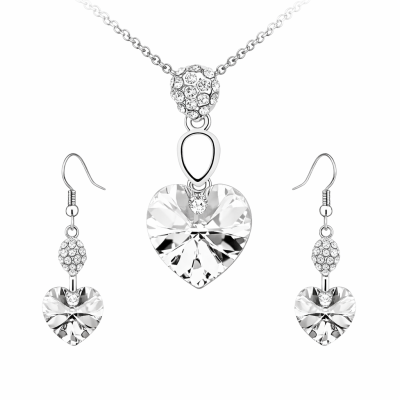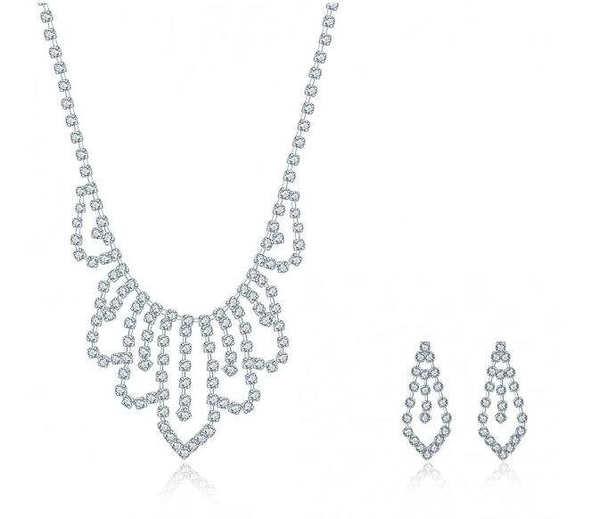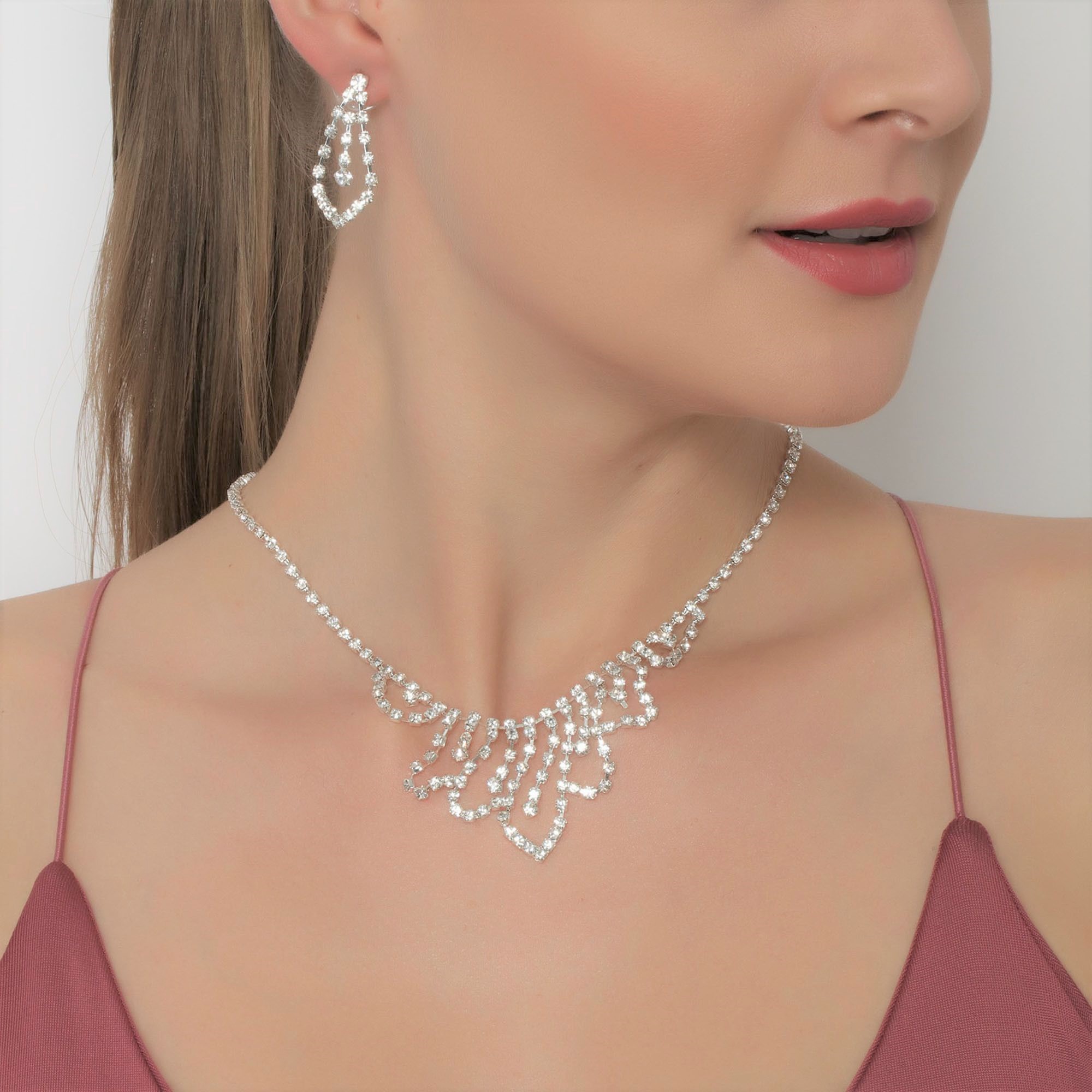Juego de aretes y collar en baño de oro blanco de 18 quilates , fino diseño estilo español con incrustaciones de cristales en color blanco. Fabricado en una estructura de aleación de platino con rodio sin níquel.