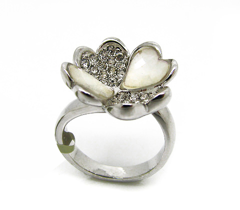 Bonito anillo, en baño de oro blanco de 18 quilates, con corazones nacarados, que forman un trébol e incrustaciones de cristales blancos. Fabricado en una estructura de aleación de platino con rodio sin níquel.