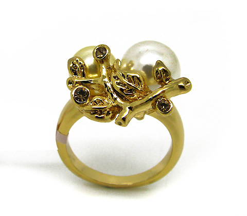 Hermoso anillo, en baño de oro amarillo de 18 quilates, con diseño de hojas, perlas blancas e incrustaciones de cristales color tabaco. Fabricado en una estructura de aleación de platino con rodio sin níquel.