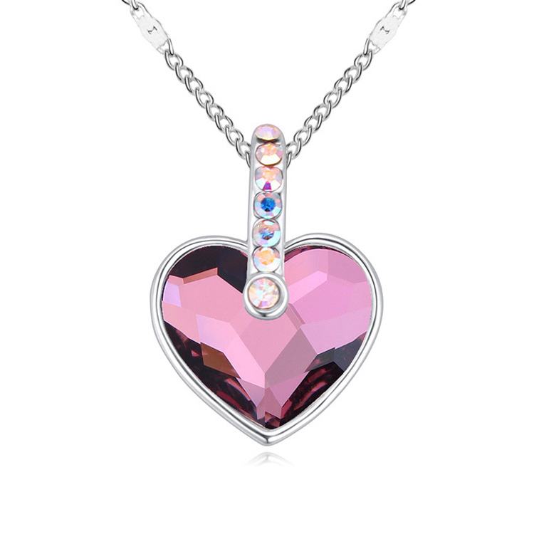 Hermoso dije en baño de oro blanco de 18 quilates, diseño de corazón con incrustaciones de cristales en color morado y tornasol. Fabricado en una estructura de aleación de platino con rodio sin níquel.