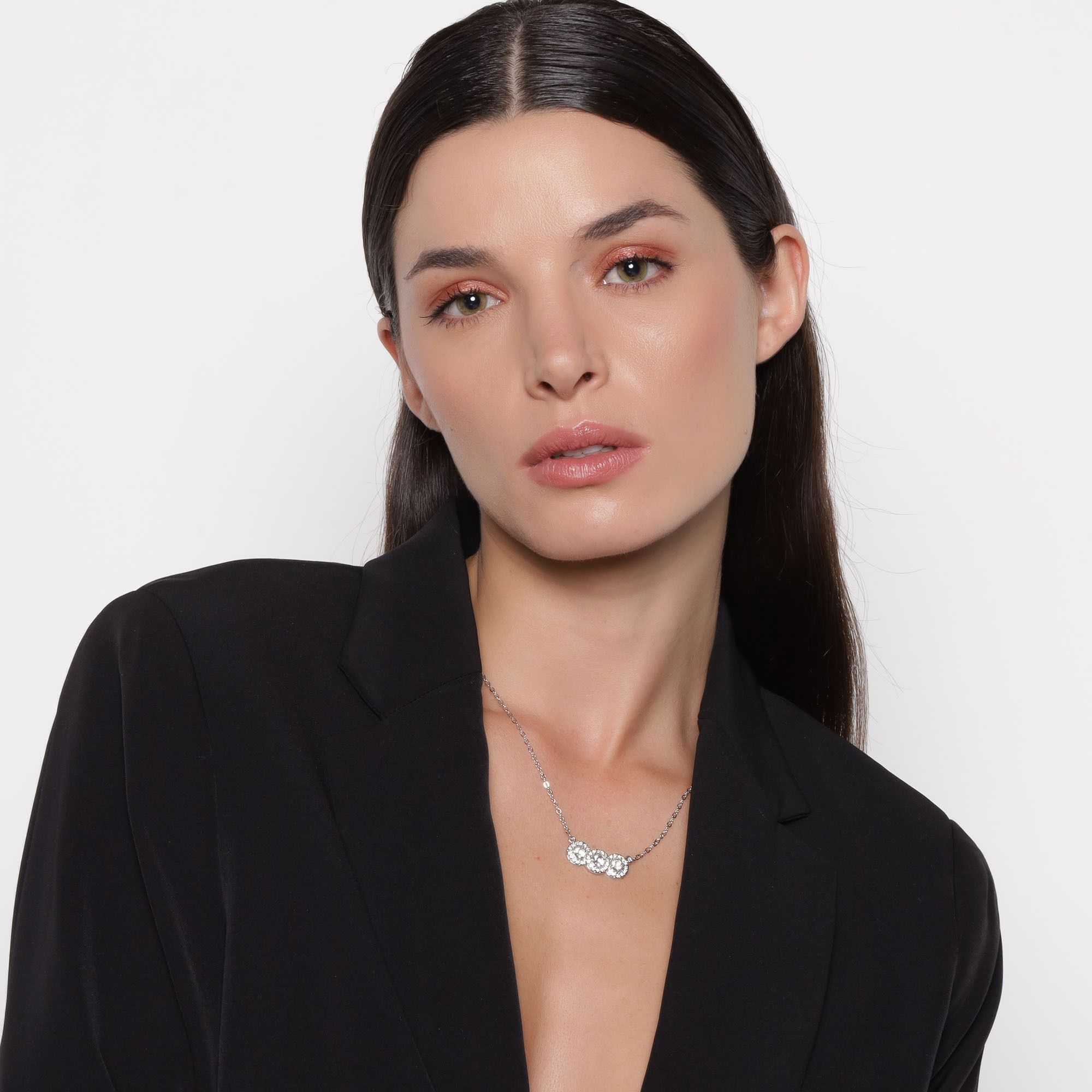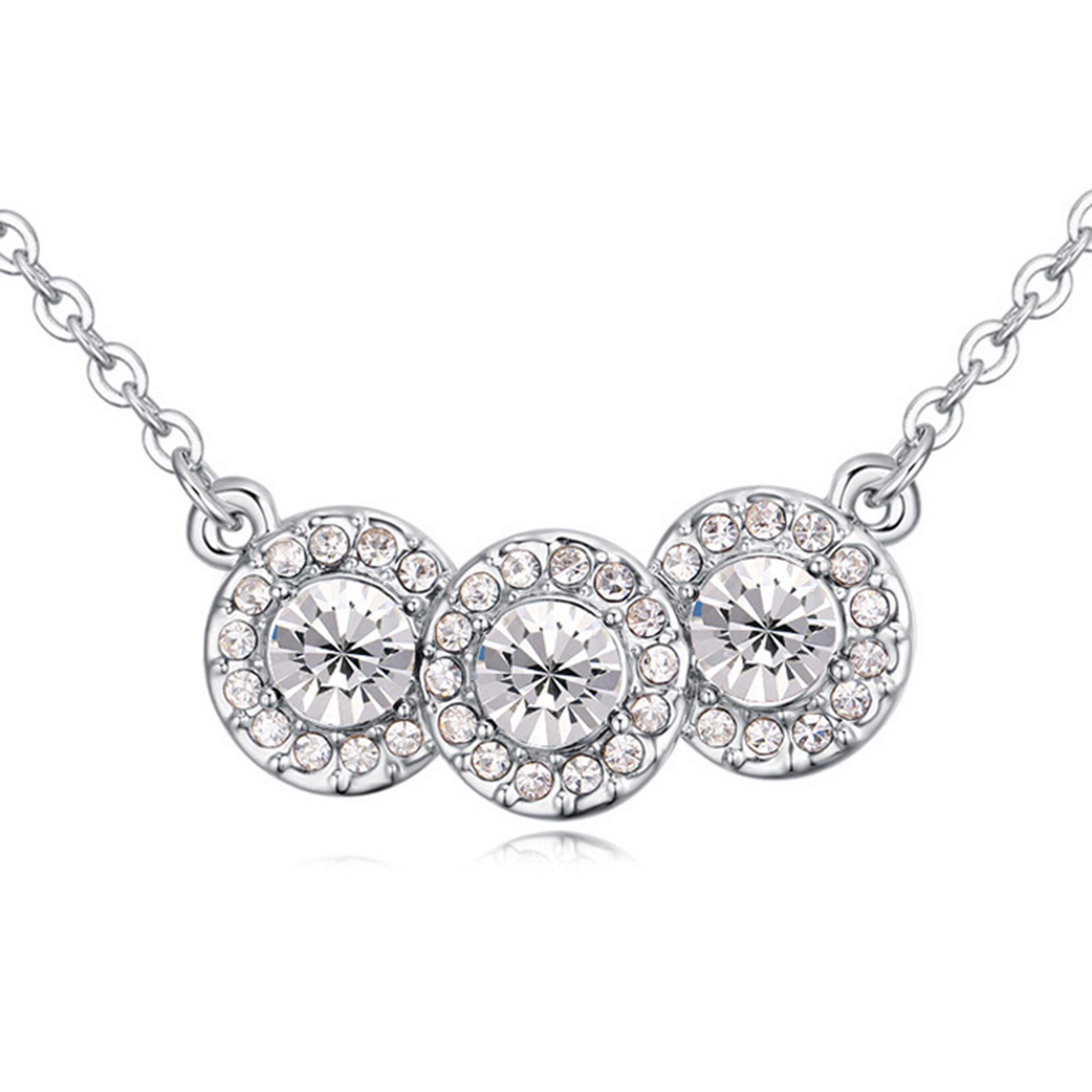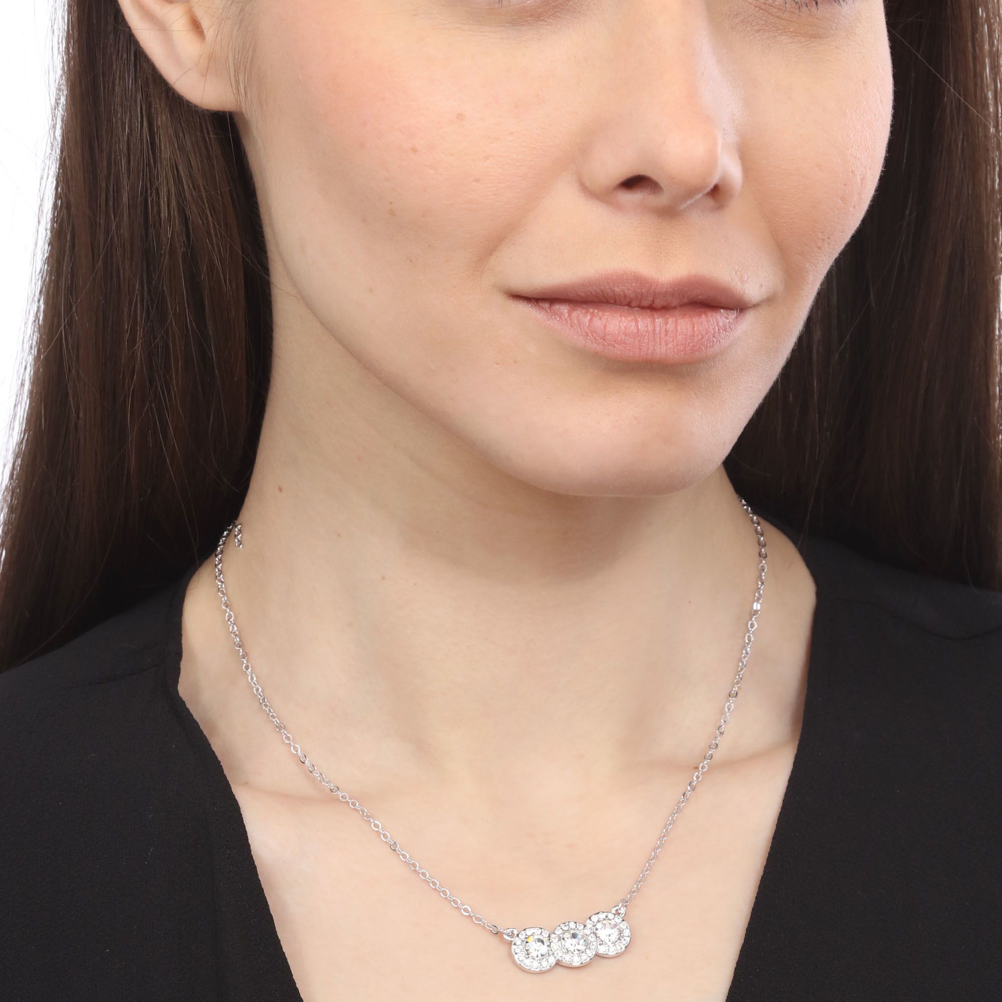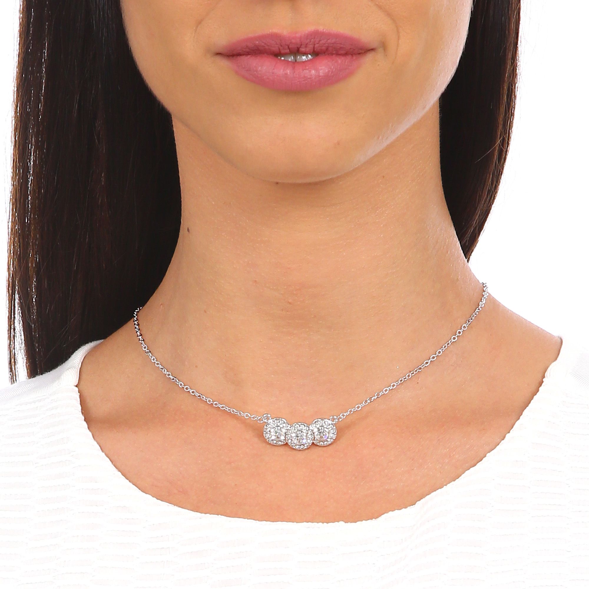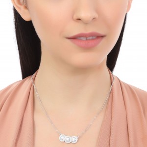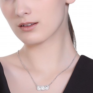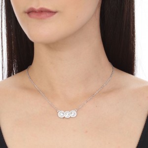 Collar en baño de oro blanco de 18 quilates, diseño de c´riculos con cristales blancos corte brillante e incrustaciones de cristales en color blanco. Fabricado en una estructura de aleación de platino con rodio sin níquel.