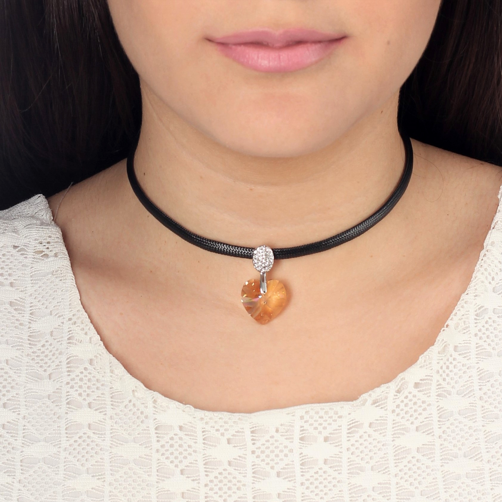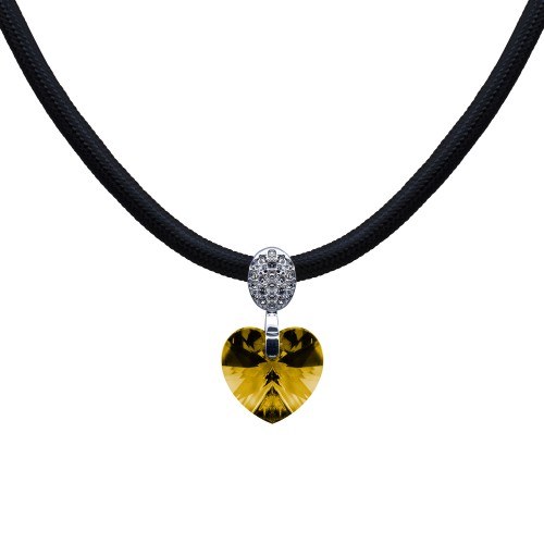 Original collar con detalles en baño de oro blanco de 18 quilates, corazón de cristal color ámbar, correa negra e incrustaciones de cristales blancos. Fabricado en una estructura de aleación de platino con rodio sin níquel.