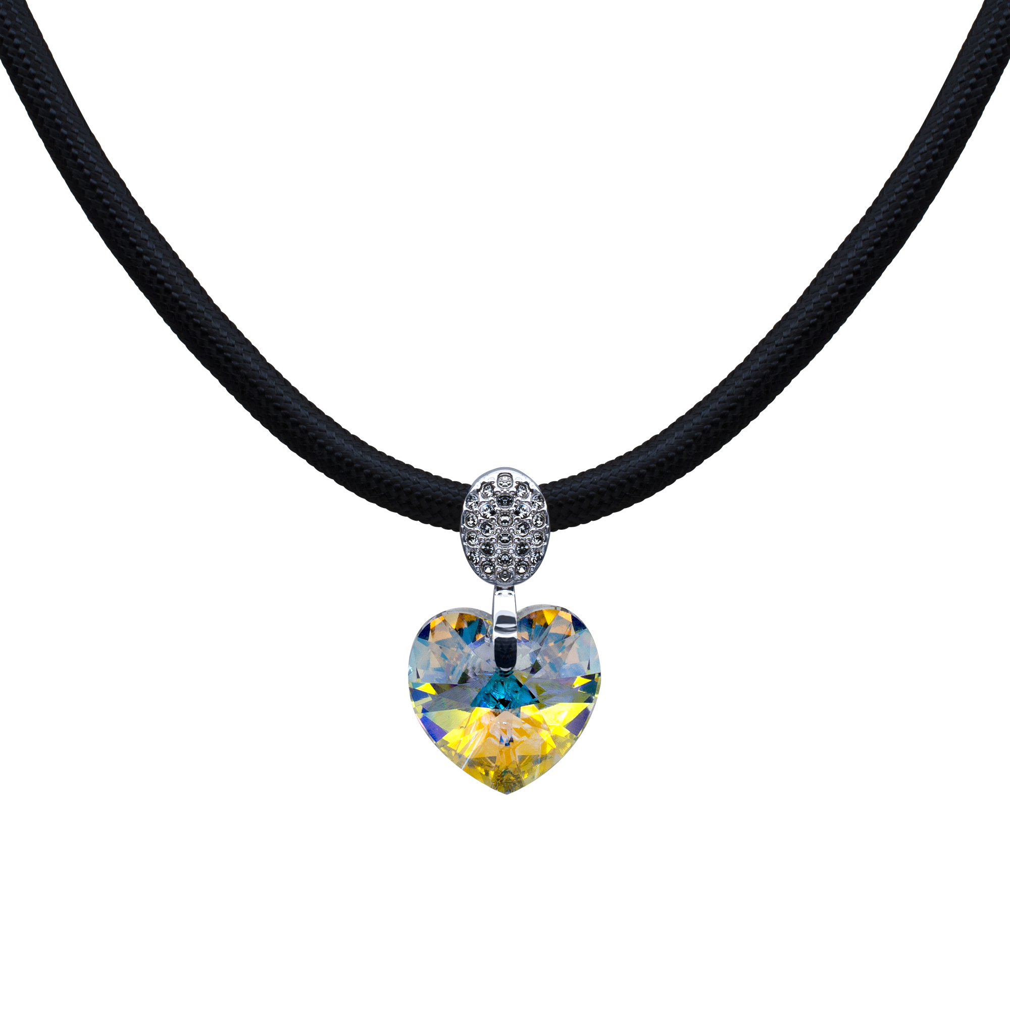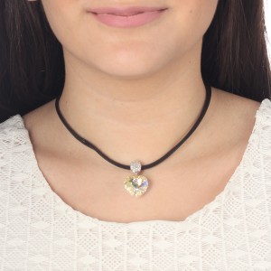 Original collar, con detalles en baño de oro blanco de 18 quilates, corazón de cristal color tornasol, correa negra e incrustaciones de cristales blancos. Fabricado en una estructura de aleación de platino con rodio sin níquel.