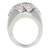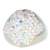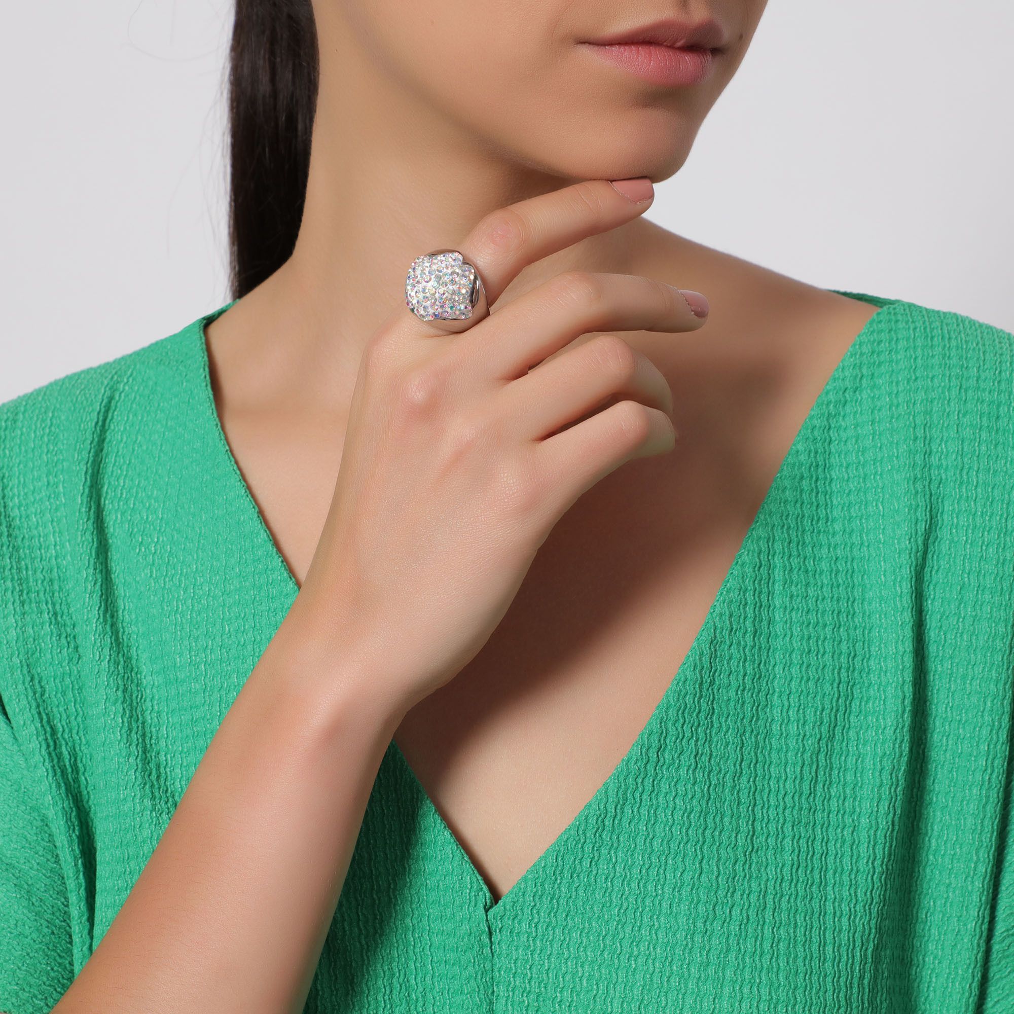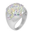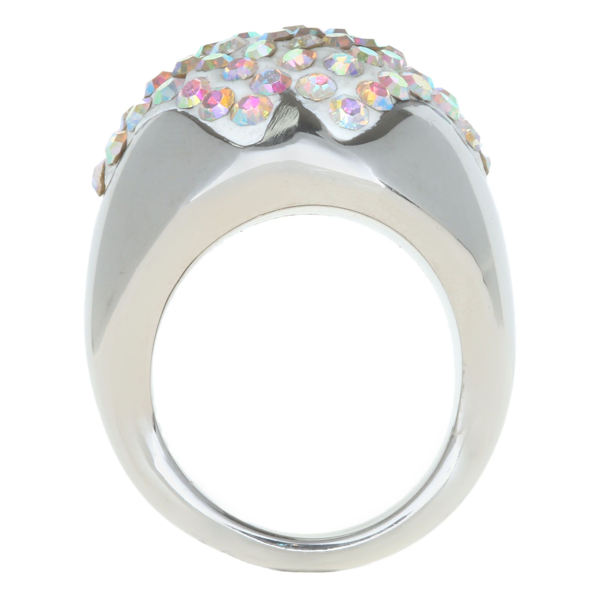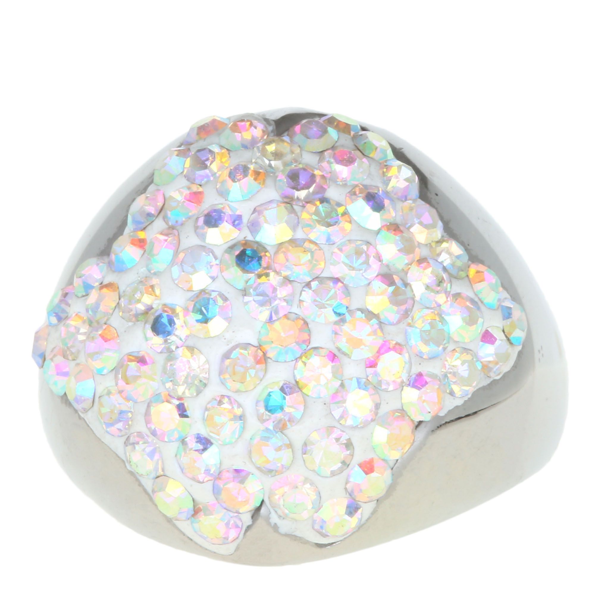 Exquisito anillo en baño de oro blanco de 18 quilates, diseño convexo, con incrustaciones de cristales en color tornasol. Fabricado en una estructura de acero inoxidable.