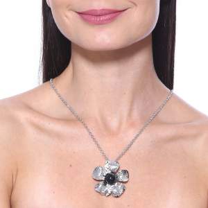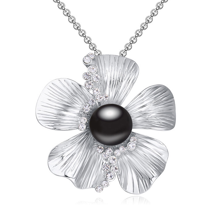 Collar en baño de oro blanco de 18 quilates, diseño de flor con perla negra e incrustaciones de cristales en color blanco. Fabricado en una estructura de aleación de platino con rodio sin níquel.