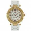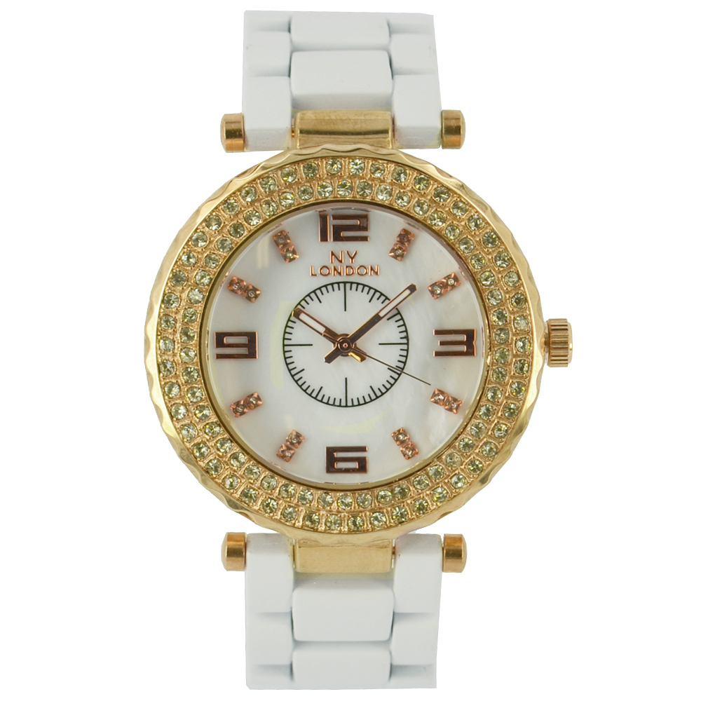 Hermoso Reloj NY, de metal en color blanco, con detalles de baño de oro amarillo de 18 quilates , elegante diseño e incrustaciones de cristales blancos. Fabricado en una estructura de aleación de platino con rodio sin níquel.