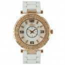 Hermoso Reloj NY, de metal en color blanco con detalles de baño de oro rosa de 18 quilates , elegante diseño con incrustaciones de cristales blancos. Fabricado en una estructura de aleación de platino con rodio sin níquel.