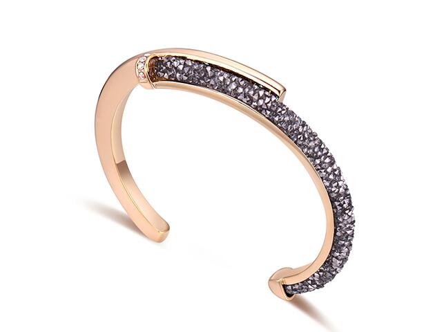 Elegante brazalete en baño de oro amarillo de 18 quilates, diseño enlazado, con incrustración de cristales color blanco y gris. Fabricado en una estructura de aleación de platino con rodio sin níquel.