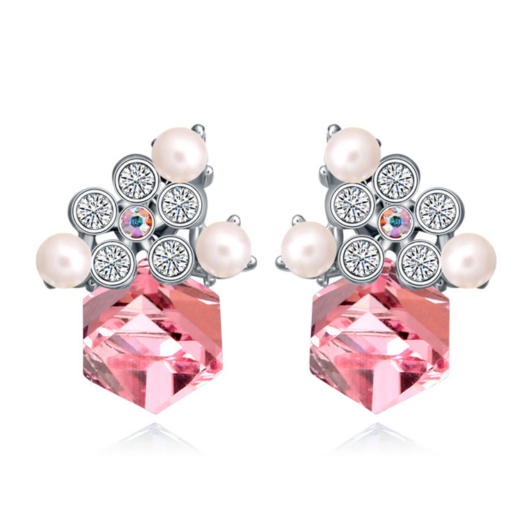 Hermosos aretes en baño de oro blanco de 18 quilates, con cristal rosa corte cúbico, detalles de perlas blancas, cristal tornasol e incrustaciones de cristales blancos. Fabricado en una estructura de aleación de platino con rodio sin níquel.