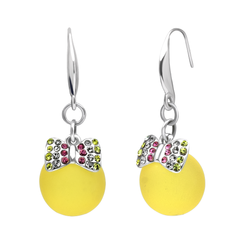 Originales aretes en baño de oro blanco de 18 quilates con esfera de cristal amarillo opaco, detalle de moño e incrustaciones de cristales blancos. Fabricado en una estructura de aleación de platino con rodio sin níquel.