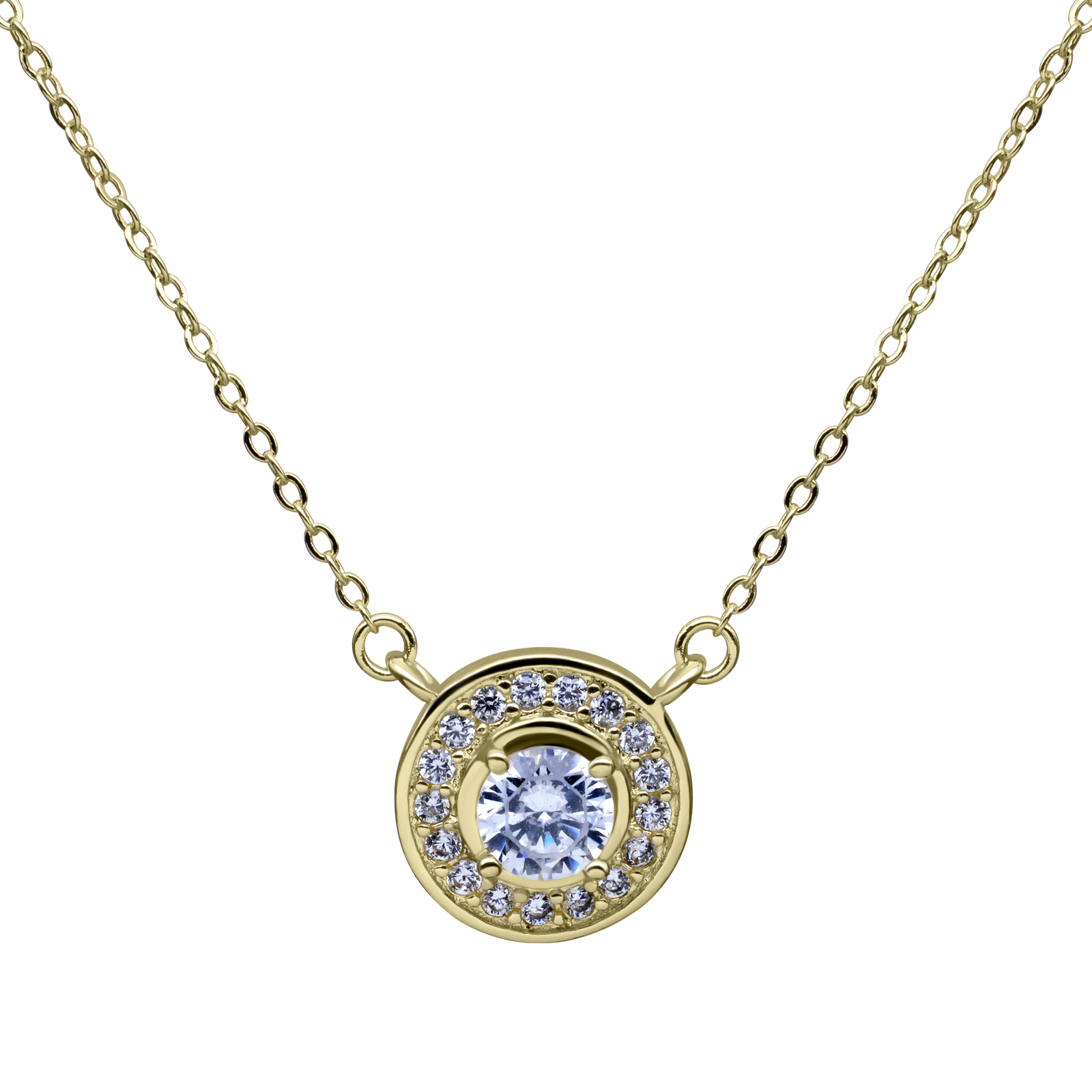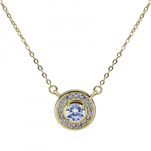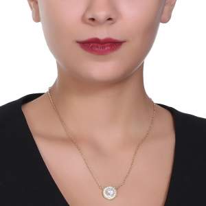 Collar en baño de oro amarillo de 18 quilates, diseño de circulo con cristal blanco corte brillante e incrustaciones de cristales en color blanco. Fabricado en una estructura de aleación de platino con rodio sin níquel.