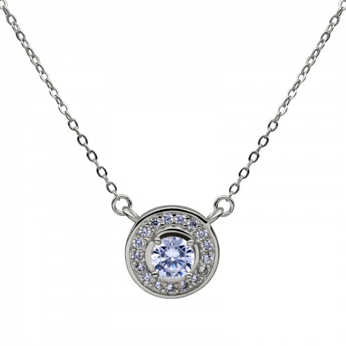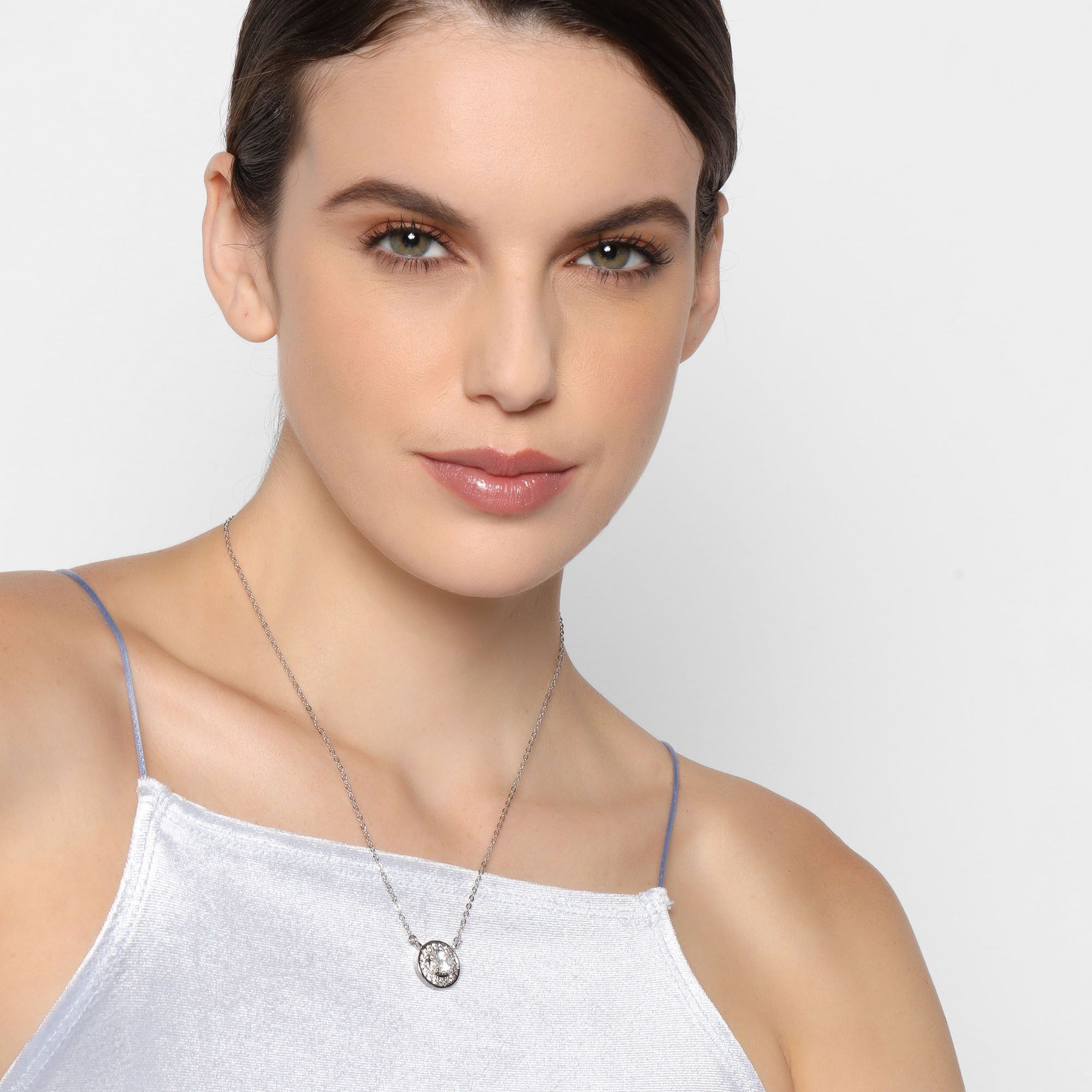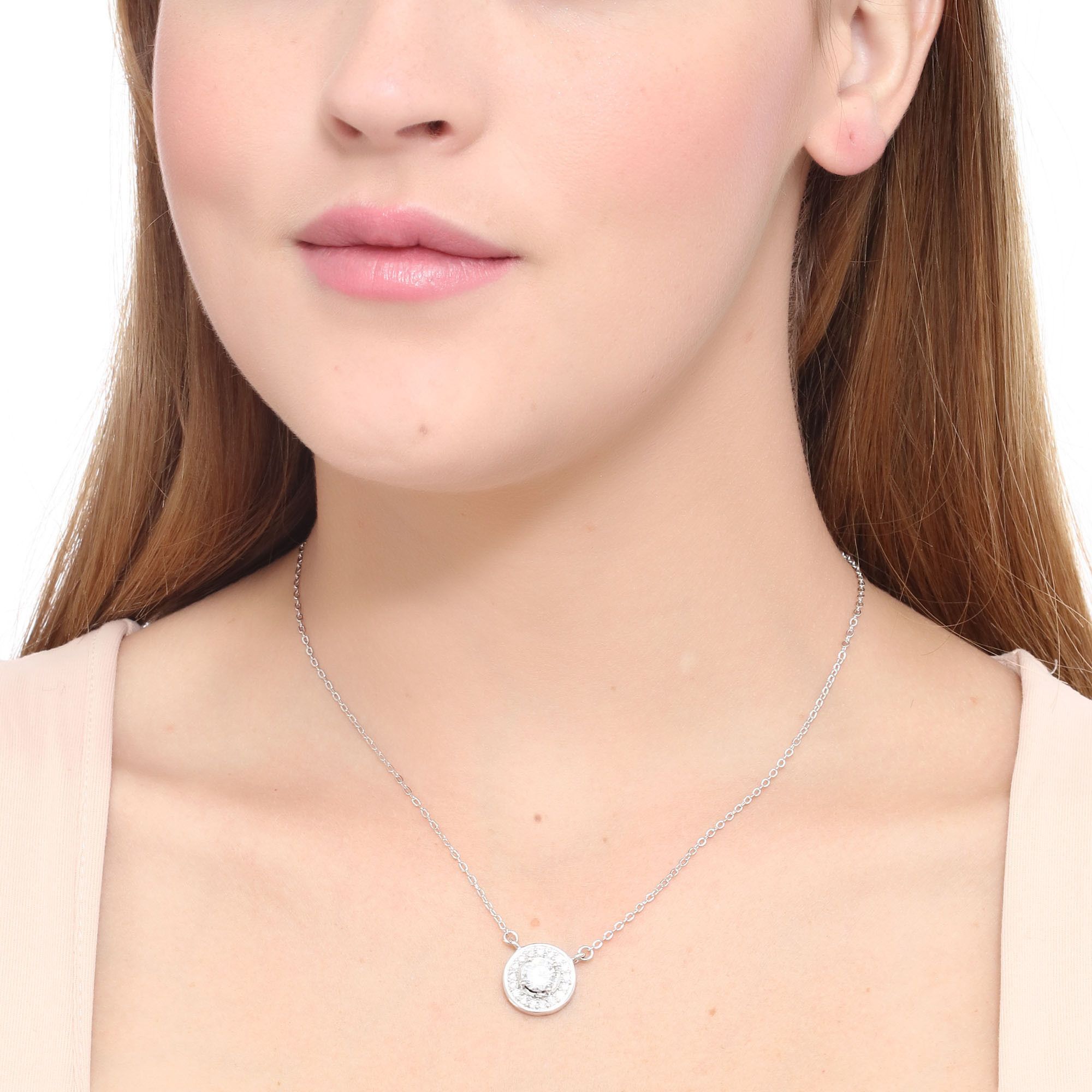 Collar en baño de oro blanco de 18 quilates, diseño de circulo con cristal blanco corte brillante e incrustaciones de cristales en color blanco. Fabricado en una estructura de aleación de platino con rodio sin níquel.
