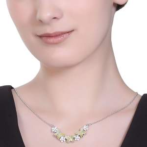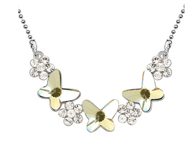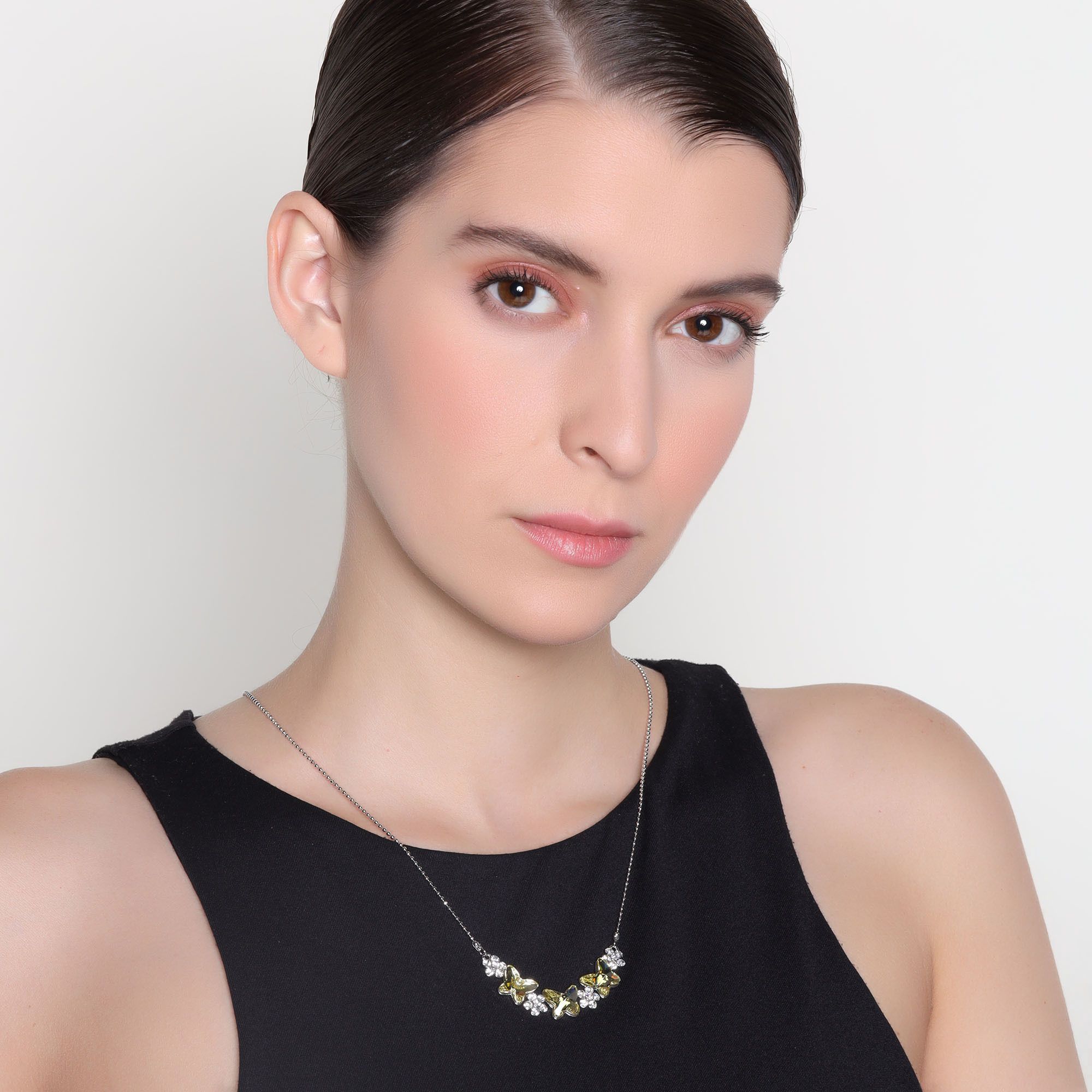 Collar en baño de oro blanco de 18 quilates, diseño de mariposas con incrustaciones de cristales en color amarillo y blanco. Fabricado en una estructura de aleación de platino con rodio sin níquel.