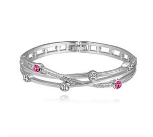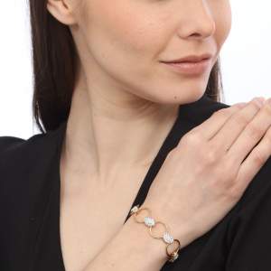 Elegante brazalete en baño de oro amarillo y blanco de 18 quilates diseño de aros y óvalos e incrustaciones de cristales blancos. Fabricado en una estructura de aleación de platino con rodio sin níquel.