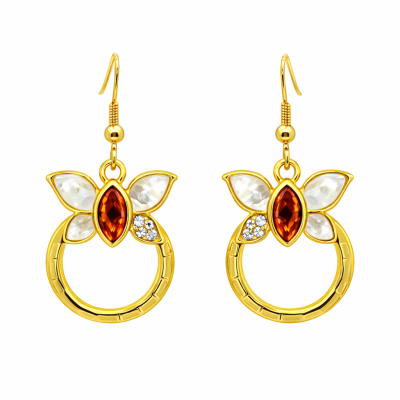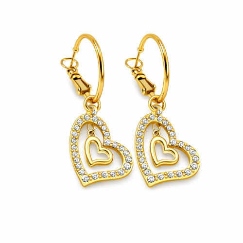 Finos aretes en baño de oro amarillo de 18 quilates con corazones dorados estilizados e incrustaciones de cristales. Fabricado en una estructura de aleación de platino con rodio sin níquel.