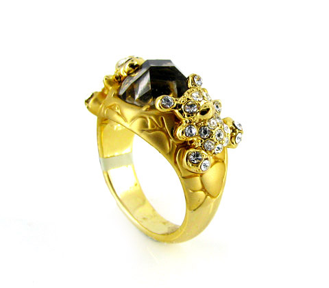 Original anillo, en baño de oro amarillo de 18 quilates, detalle de osos dorados con delicadas chispas de cristales blancos y cristal color humo. Fabricado en una estructura de aleación de platino con rodio sin níquel.