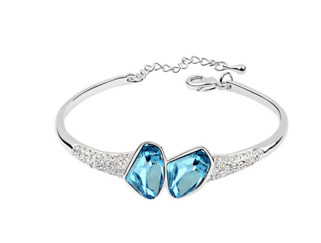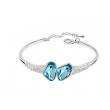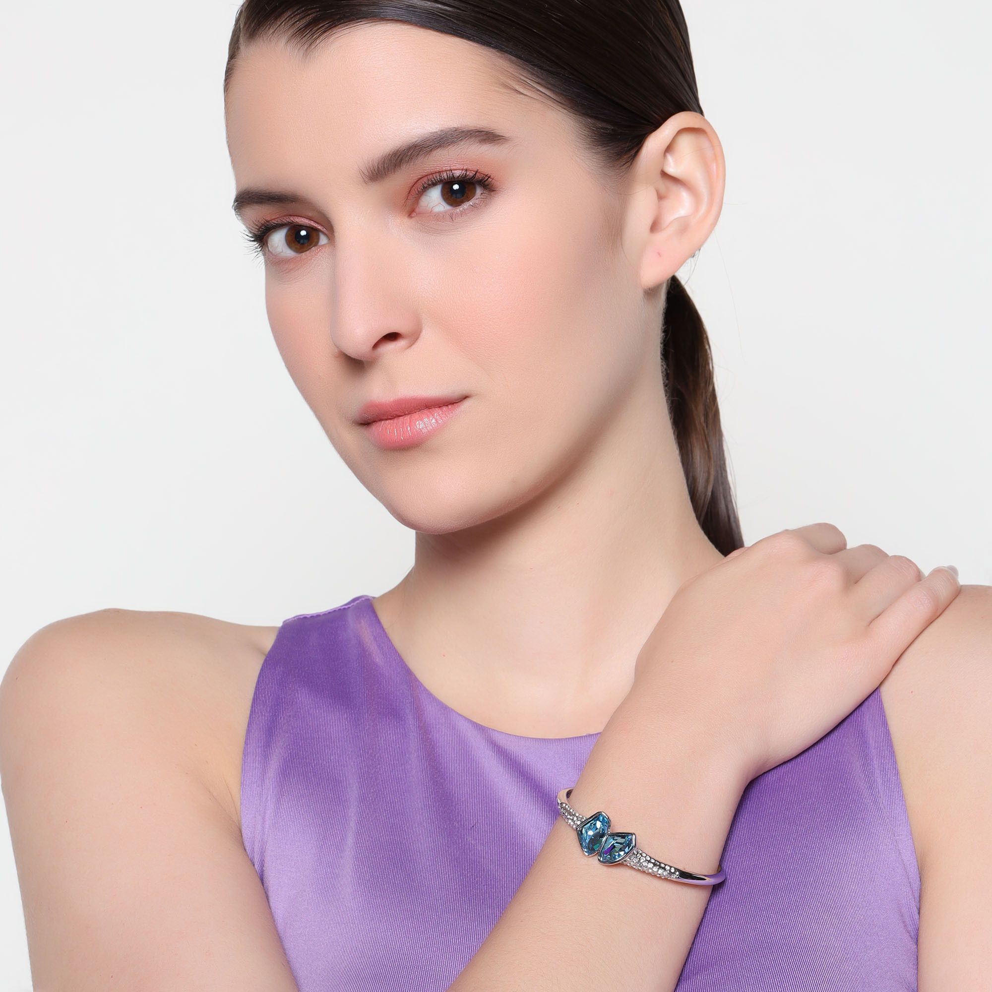 Brazalete en baño de oro blanco de 18 quilates, fino diseño con incrustaciones de cristales en color azul y blanco. Fabricado en una estructura de aleación de platino con rodio sin níquel.
