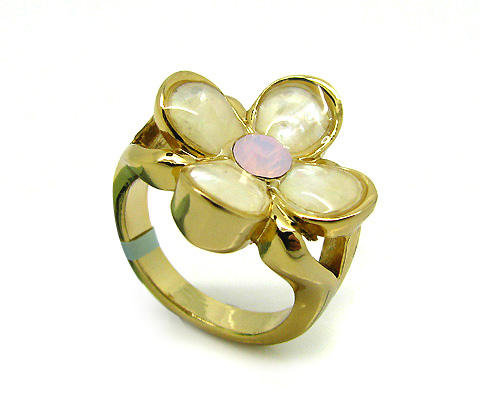 Hermoso anillo en baño de oro amarillo de 18 quilates, diseño de flor con nacarado en los pétalos y cristal bohemio color lila al centro. Fabricado en una estructura de aleación de platino con rodio sin níquel.