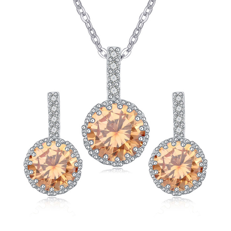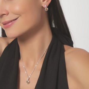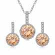 Juego de aretes y dije con cadena en baño de oro blanco de 18 quilates , diseño de círculo con incrustaciones de cristales en color ámbar y blanco corte brillante. Fabricado en una estructura de aleación de platino con rodio sin níquel.