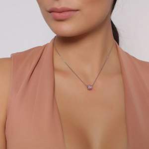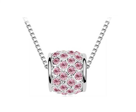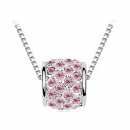 Elegante dije con cadena en baño de oro blanco de 18 quilates, diseño de cilindro con detalles de cristales en color rosa y blanco. Fabricado en una estructura de aleación de platino con rodio sin níquel.