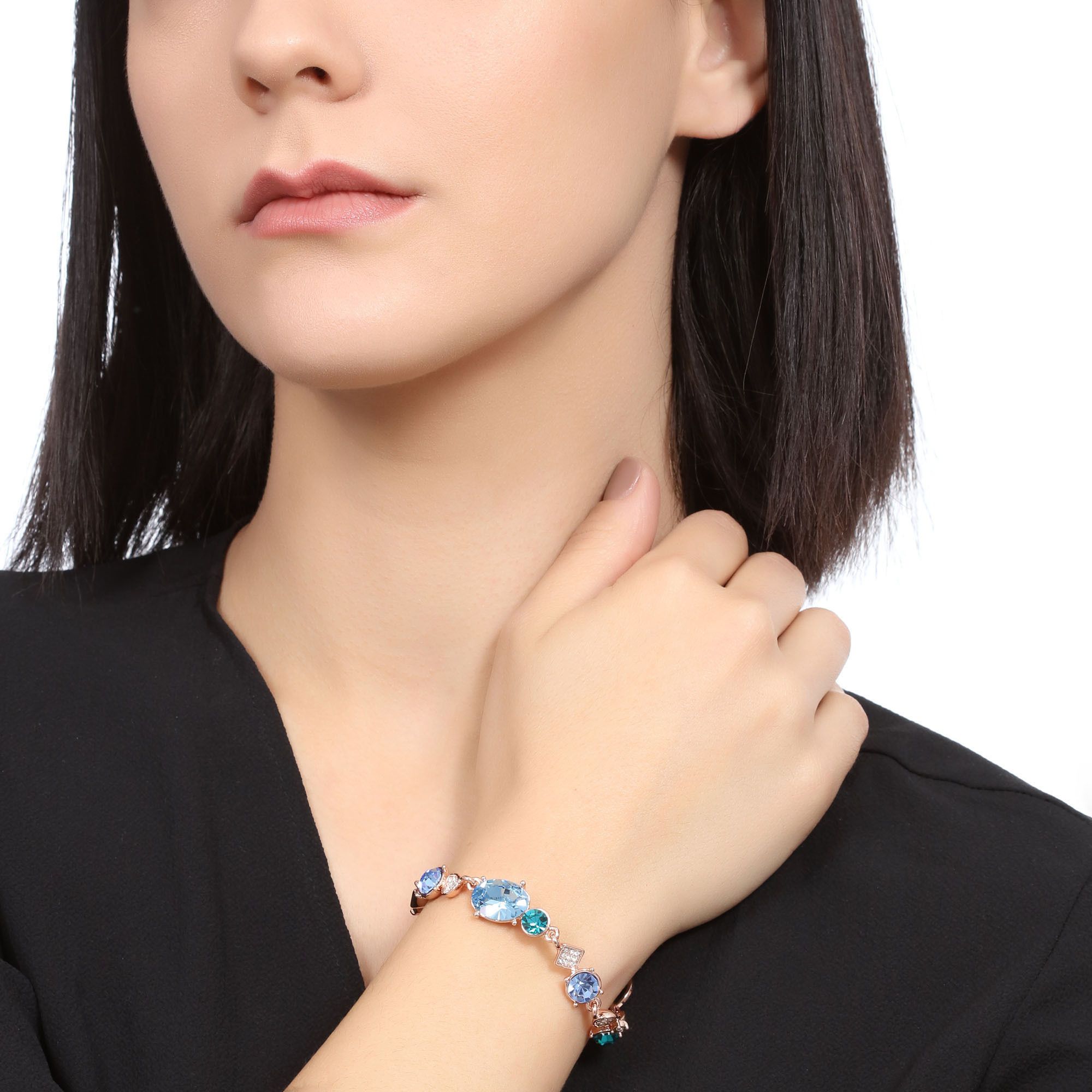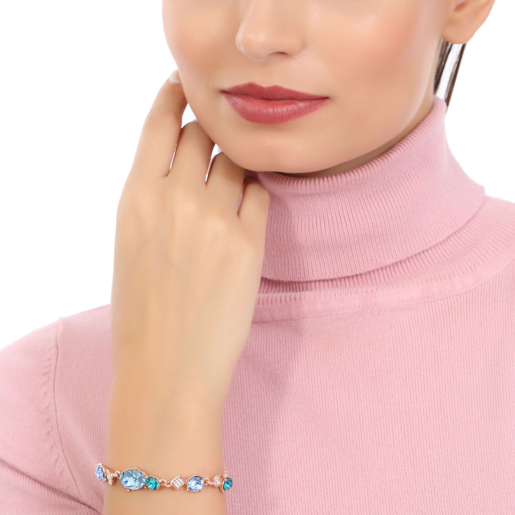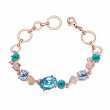 Lindo brazalete en baño de oro rosa de 18 quilates, diseño de rombos y círculos con cristal azul corte oval e incrustaciones de cristales en color azul y turquesa. Fabricado en una estructura de aleación de platino con rodio sin níquel.