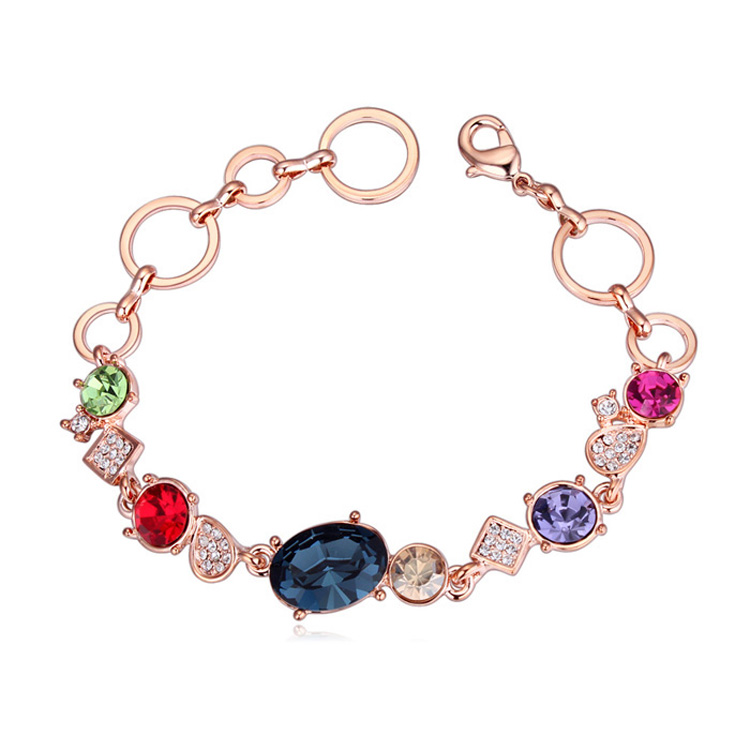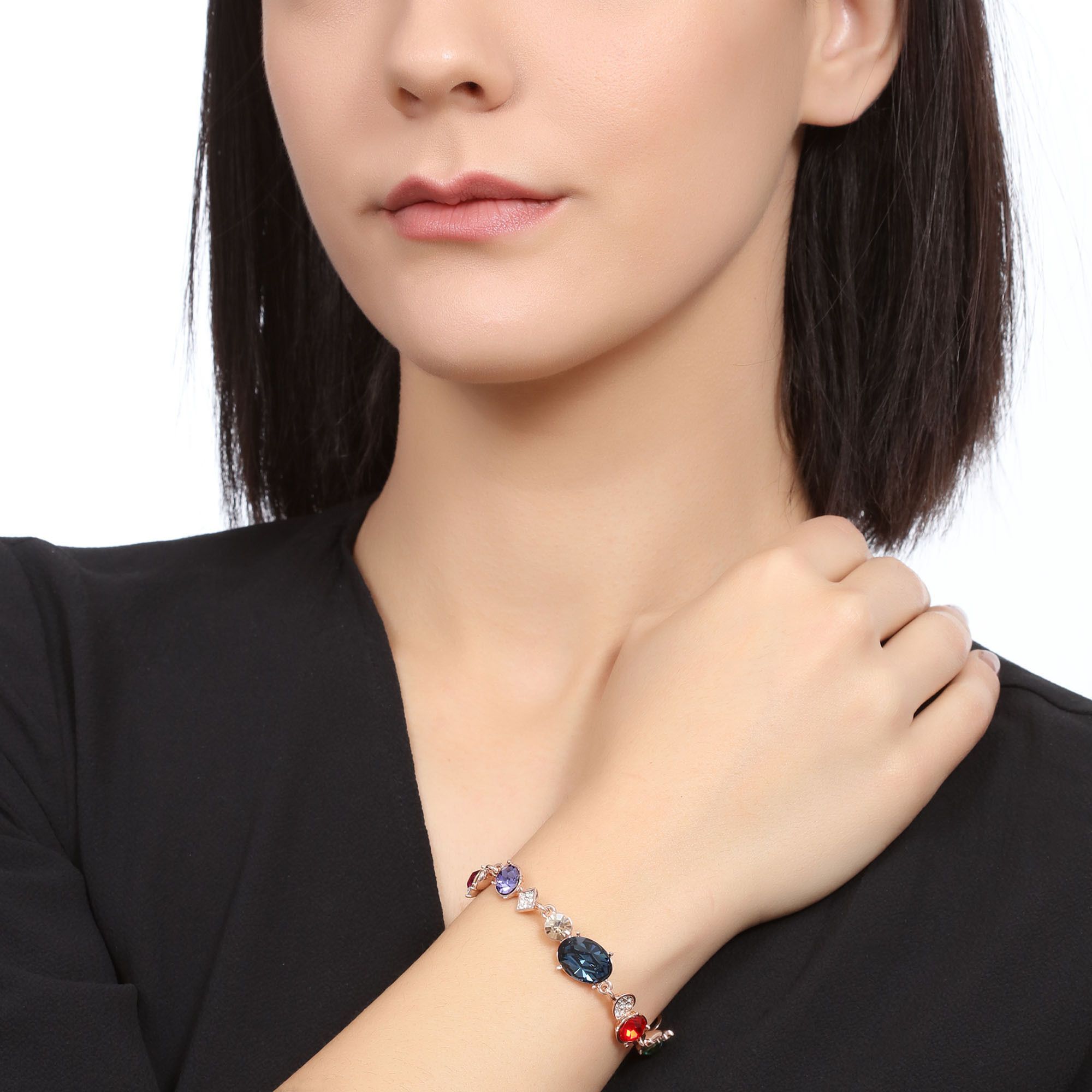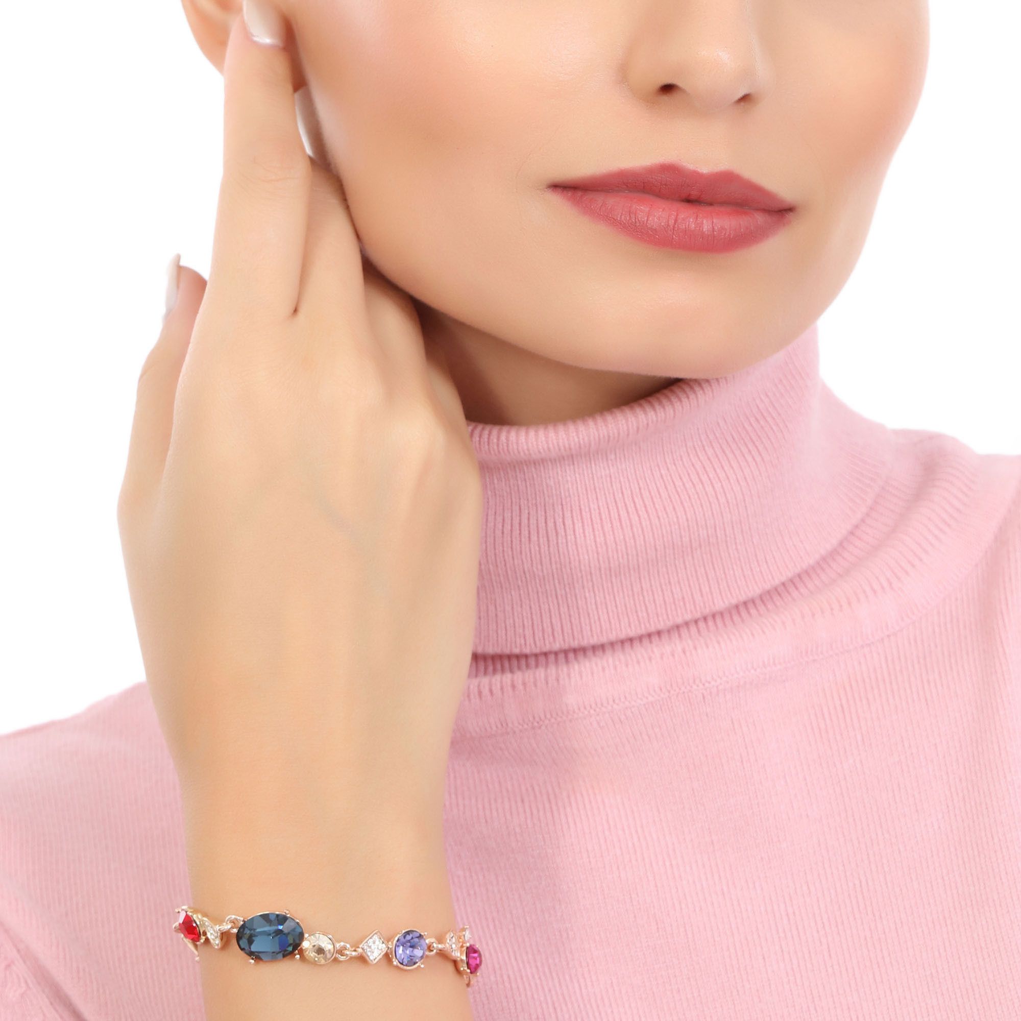 Pulsera en baño de oro rosa de 18 quilates, diseño de rombos y círculos con cristal azul corte oval e incrustaciones de cristales en colores. Fabricado en una estructura de aleación de platino con rodio sin níquel.
