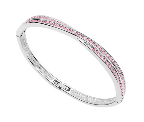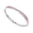 Brazalete en baño de oro blanco de 18 quilates, diseño cruzado con incrustaciones de cristales en color rosa. Fabricado en una estructura de aleación de platino con rodio sin níquel.