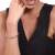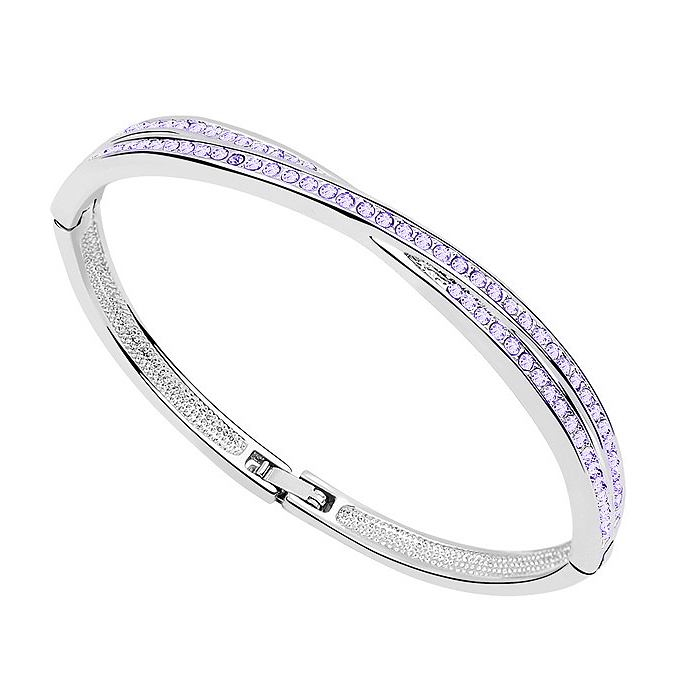 Lindo brazalete en baño de oro blanco de 18 quilates, diseño de cruzado con incrustaciones de cristales en color morado. Fabricado en una estructura de aleación de platino con rodio sin níquel.