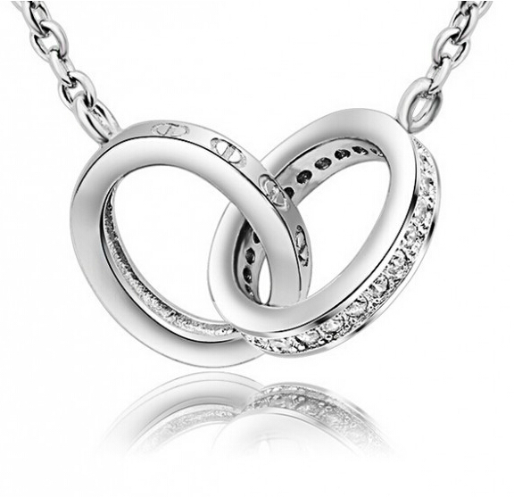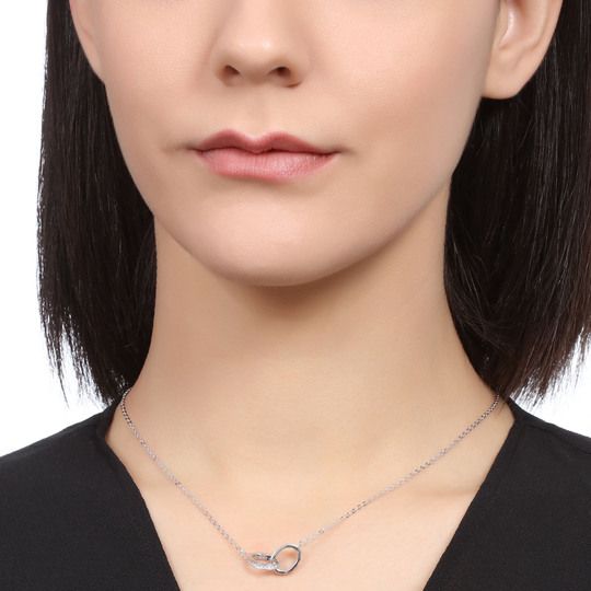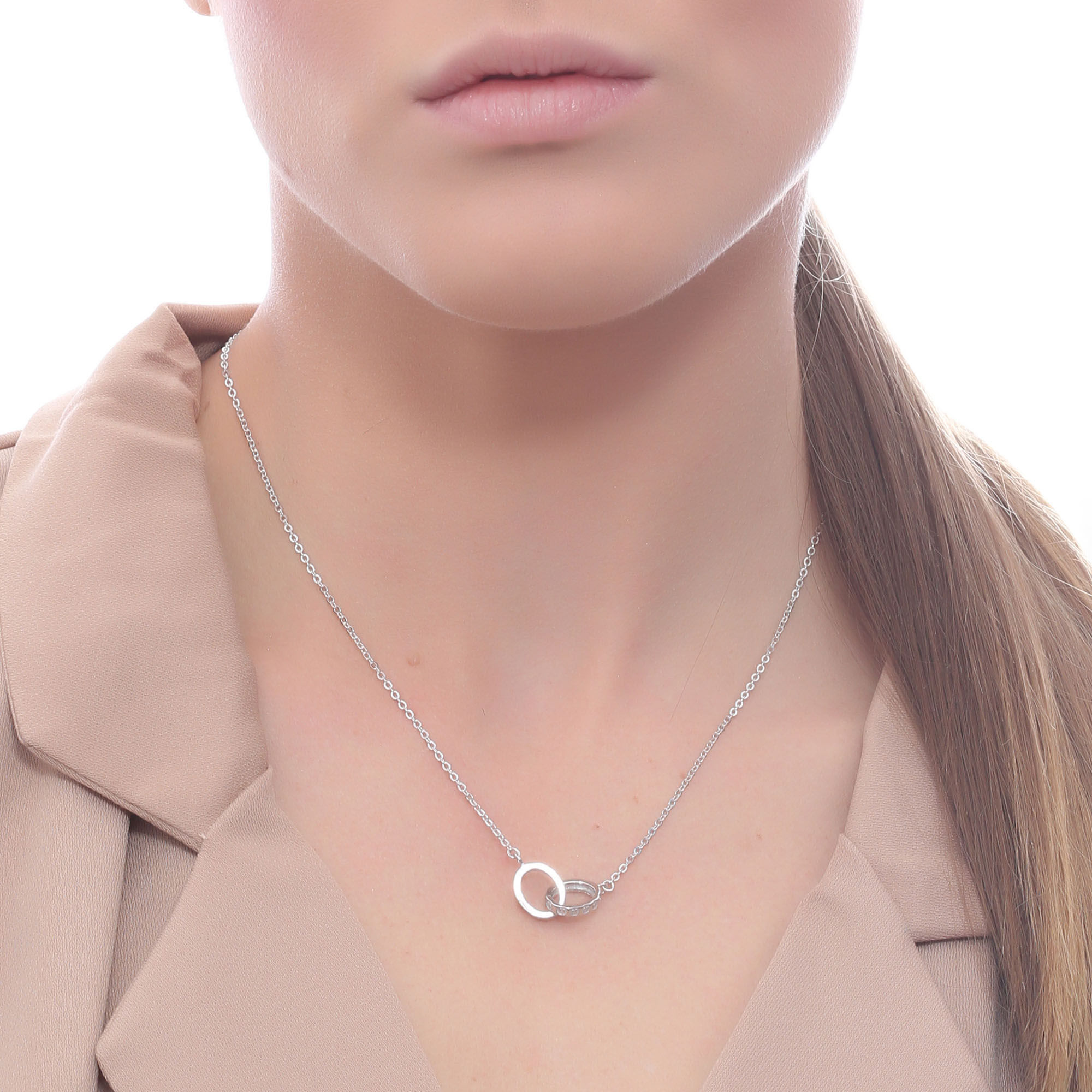 Lindo dije en baño de oro blanco de 18 quilates, diseño de aros entrelazados e incrustaciones de cristales blancos. Fabricado en una estructura de aleación de platino con rodio sin níquel.