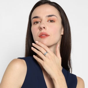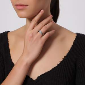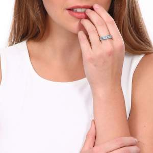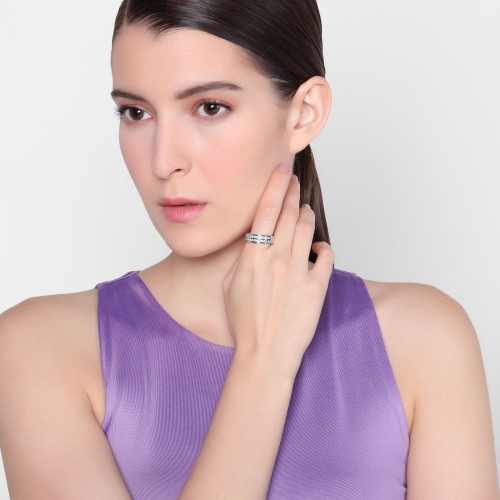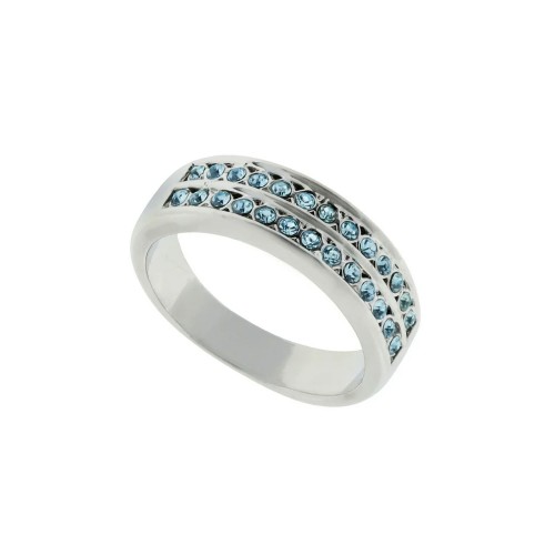 Hermosa argolla en baño de oro blanco de 18 quilates, fino diseño, con doble hilera de cristales en color azul. Fabricado en una estructura de aleación de platino con rodio sin níquel.