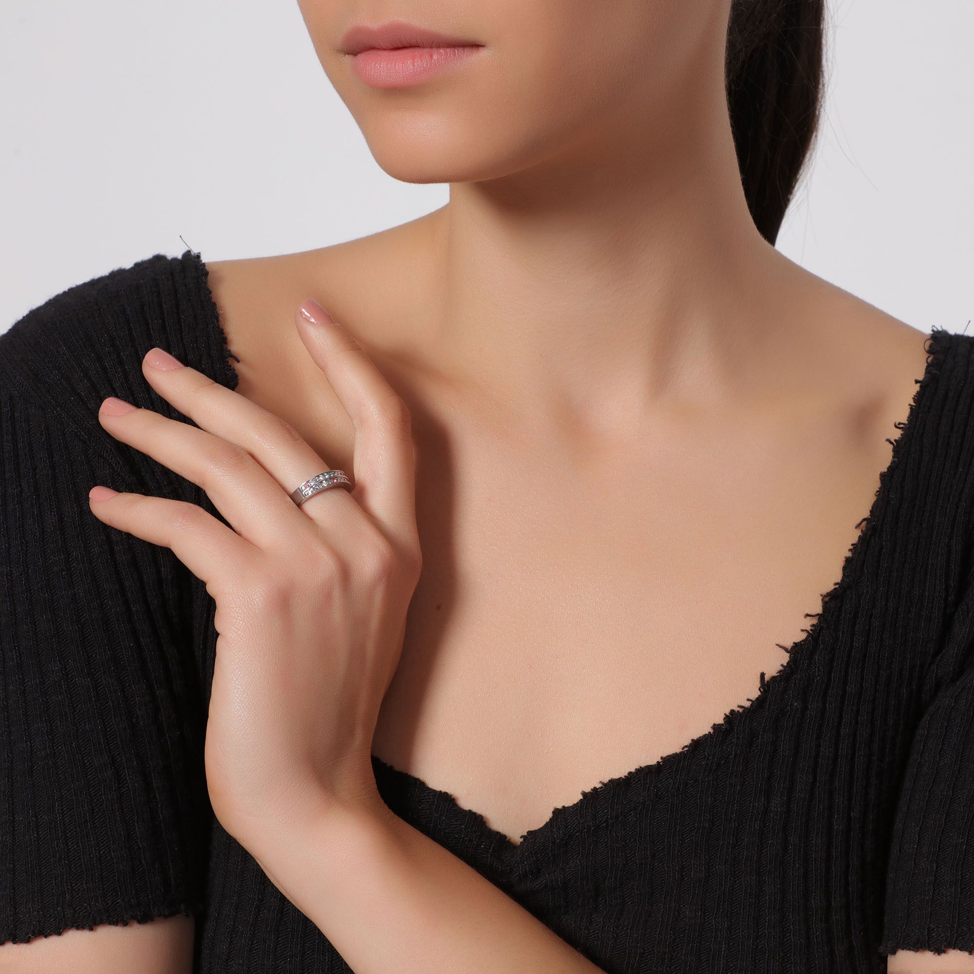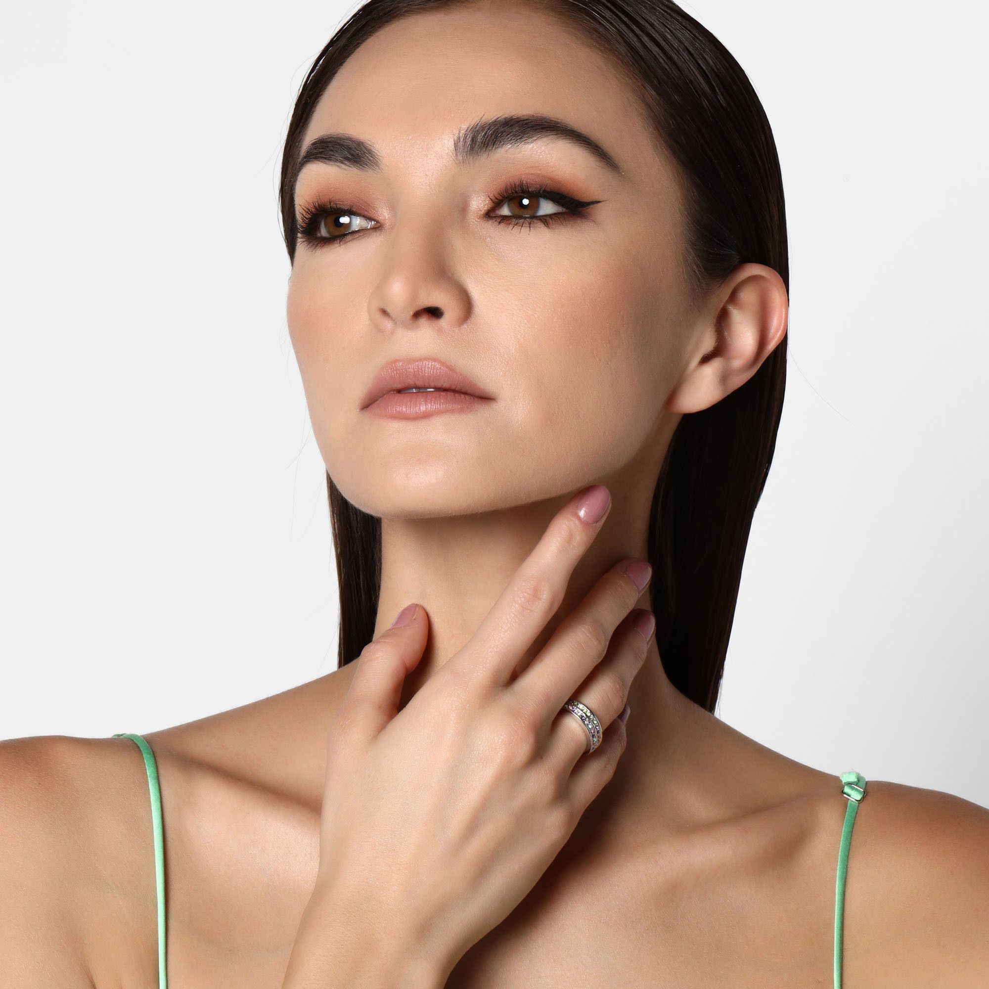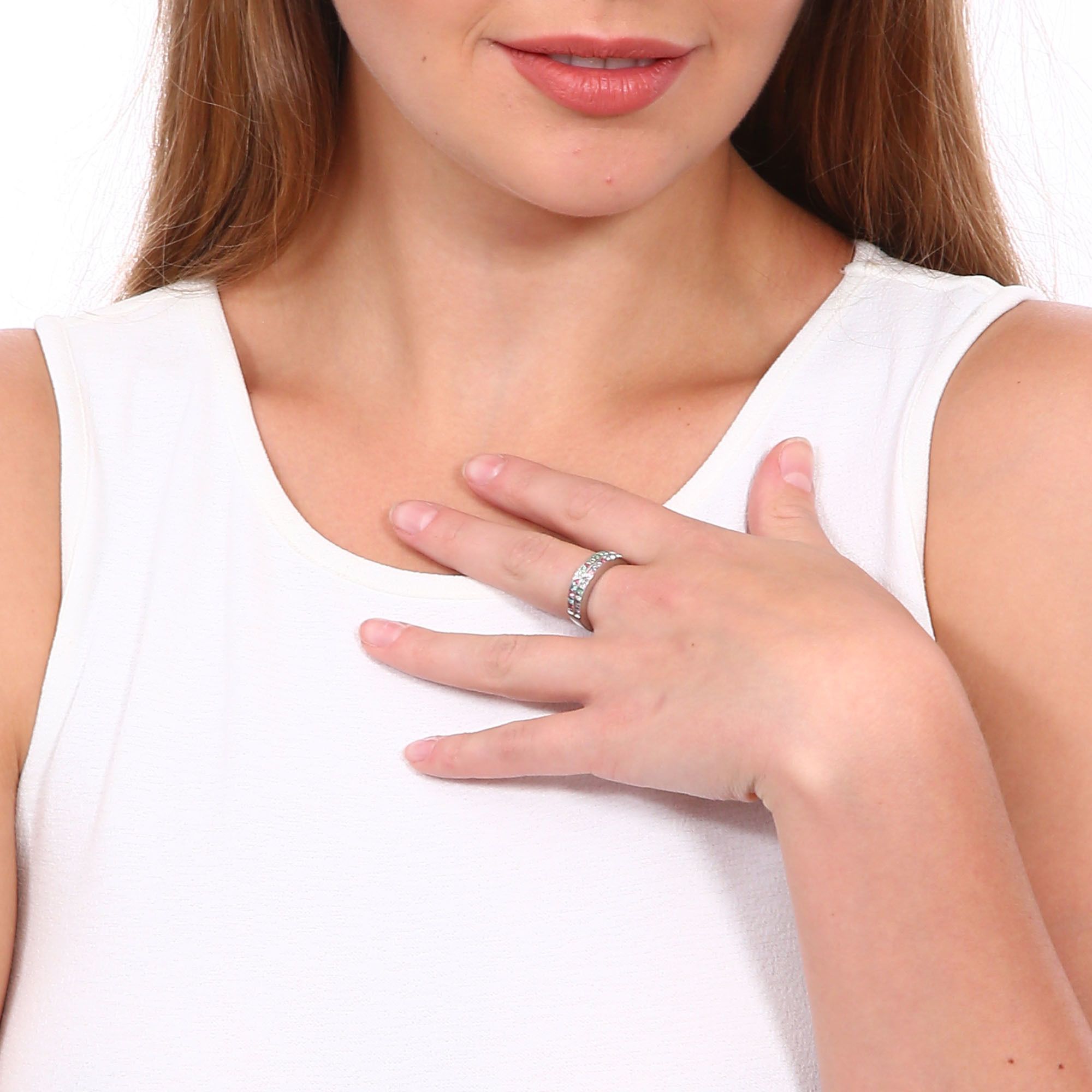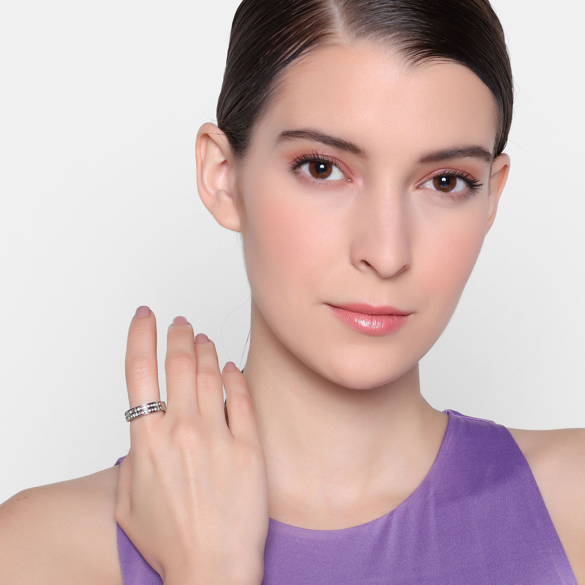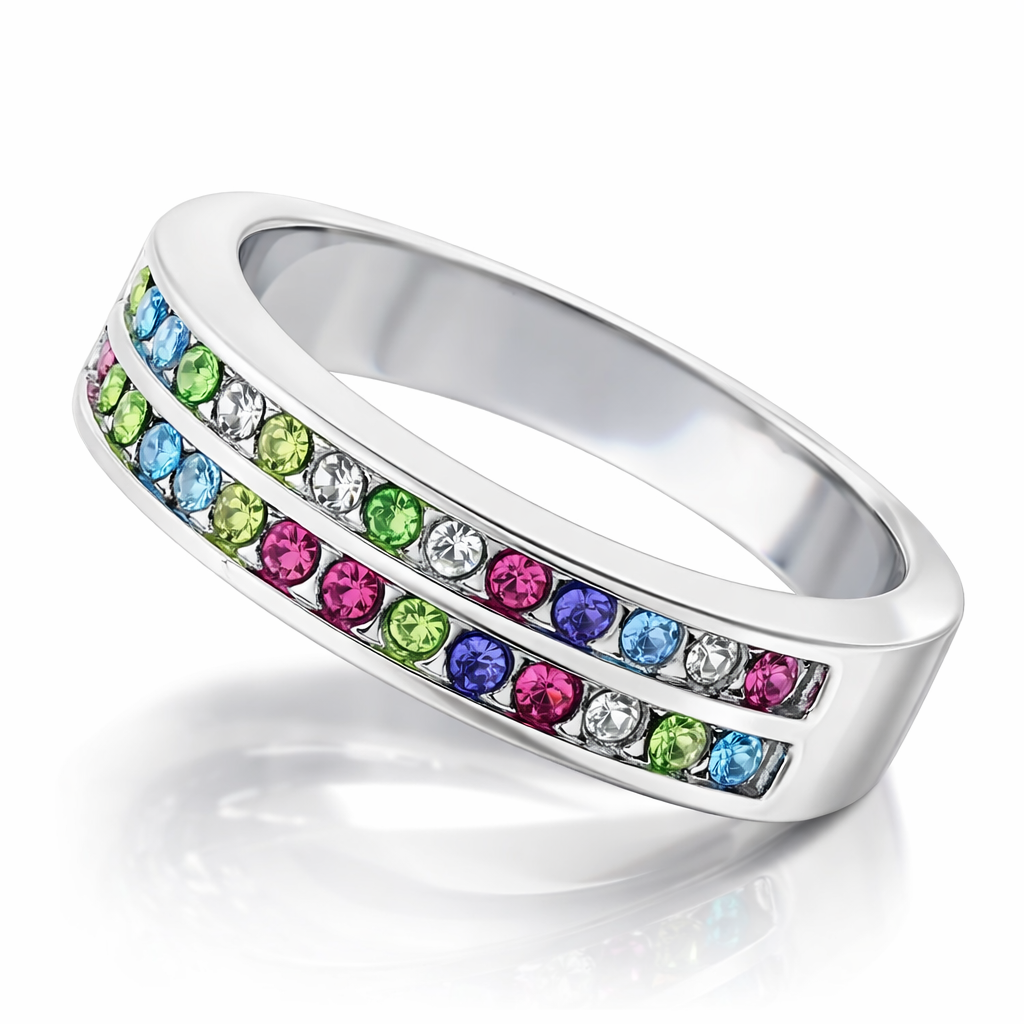 Hermosa argolla en baño de oro blanco de 18 quilates, fino diseño con doble hilera de cristales en colores. Fabricado en una estructura de aleación de platino con rodio sin níquel.
