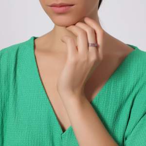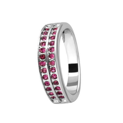 Hermosa argolla en baño de oro blanco de 18 quilates, fino diseño, con doble hilera de cristales en color rosa. Fabricado en una estructura de aleación de platino con rodio sin níquel.