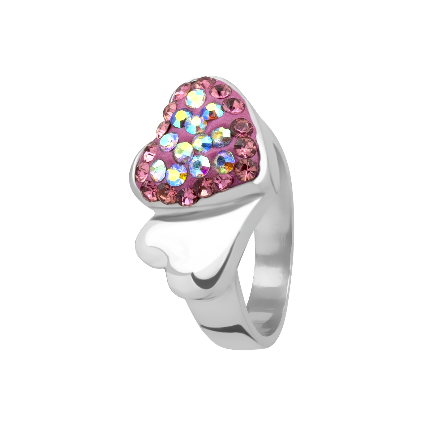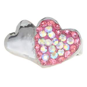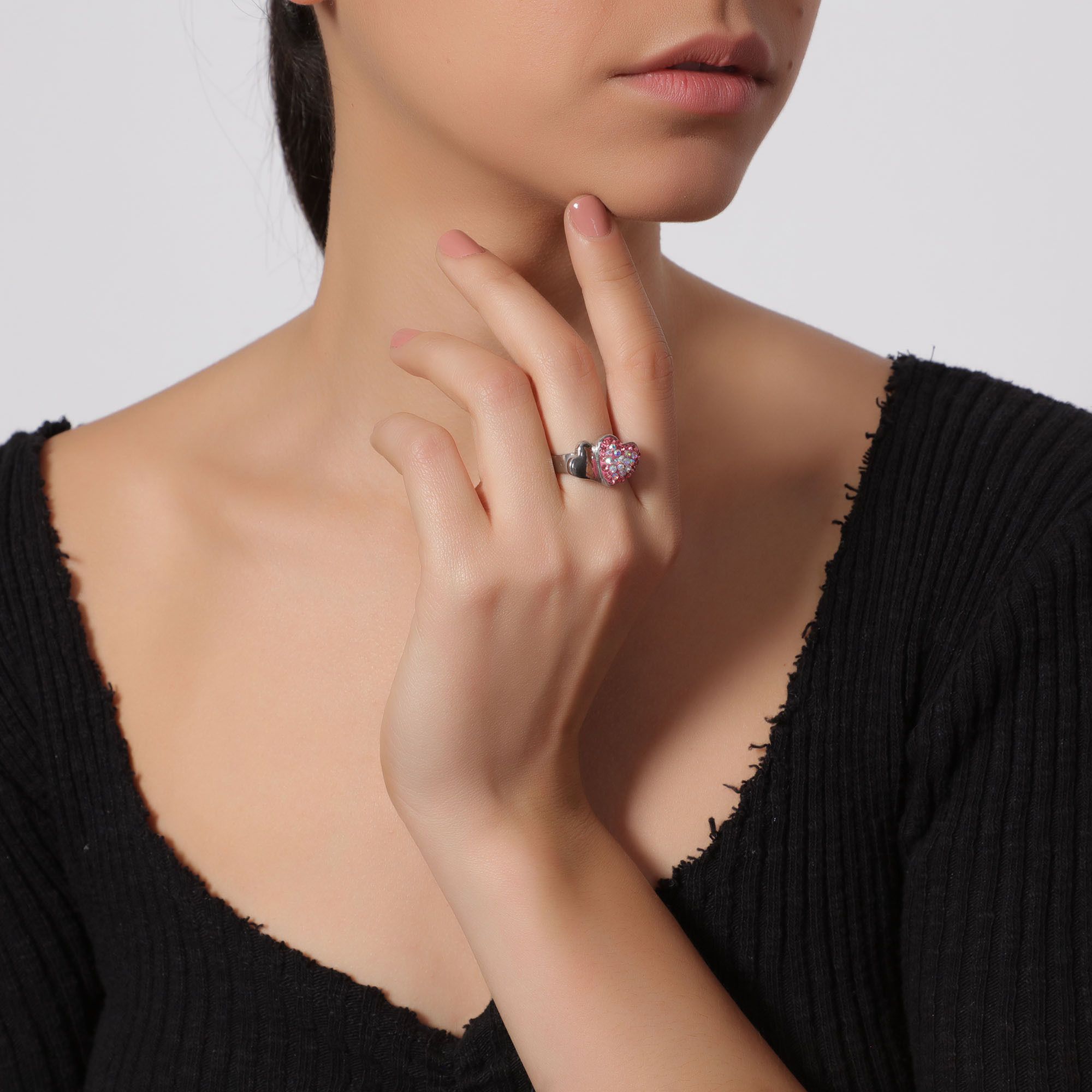 Precioso anillo, en baño de oro blanco de 18 quilates , diseño de dos corazones, con incrustaciones de cristales rosa, tornasol y blanco. Fabricado en una estructura de aleación de platino con rodio sin níquel.