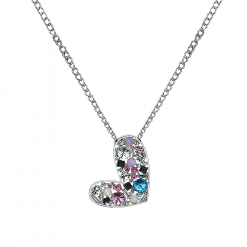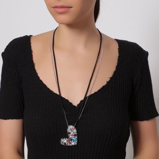 Lindo collar para sweater en baño de oro blanco de 18 quilates, cadena plateada y correa en color negro, diseño de corazón con incrustaciones de cristales en colores: fucsia, lila, negro, azul y tornasol. Fabricado en una estructura de aleación de platino con rodio sin níquel.