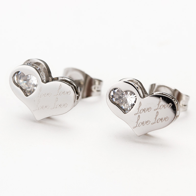 Aretes de acero inoxidable, diseño de corazón con grabado "Love" e incrustación de cristal en color blanco.