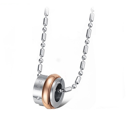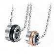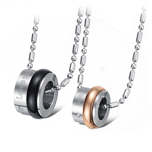 Dije de acero inoxidable, diseño de aros, color a elegir entre plata y negro o plata y rosa con grabado de frase "Love is Protect" e incrustación de cristal en color blanco.