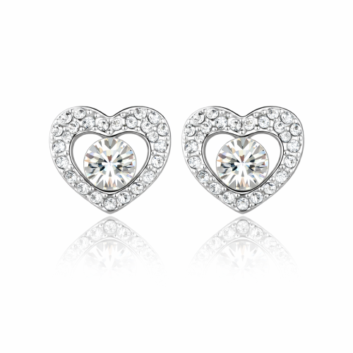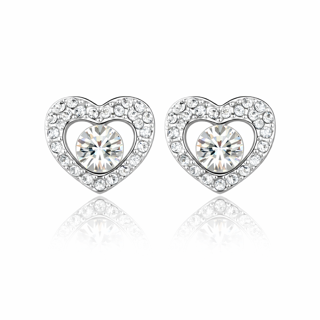 Lindos aretes en baño de oro blanco de 18 quilates, diseño de corazón con incrustaciones de cristales en color blanco. Fabricado en una estructura de aleación de platino con rodio sin níquel.
