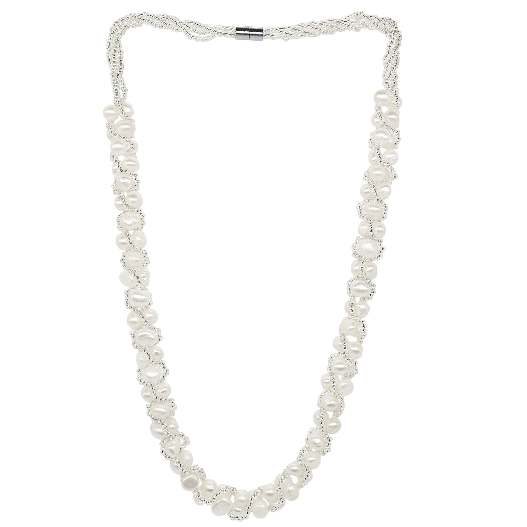 Collar de perlas cultivadas, Diseño trenzado, con perlas beige de diferentes tamaños y pequeñas cuentas ivory.