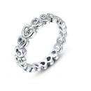 Delicado anillo en baño de oro blanco de 18 quilates, fino diseño de corazones con incrustaciones de cristales en color blanco. Fabricado en una estructura de aleación de platino con rodio sin níquel.