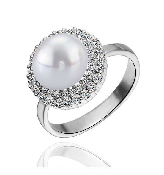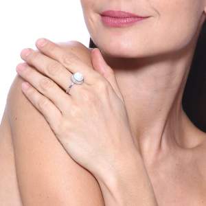 Elegante anillo en baño de oro blanco de 18 quilates, fino diseño, con perla blanca e incrustaciones de cristales en color blanco. Fabricado en una estructura de aleación de platino con rodio sin níquel.