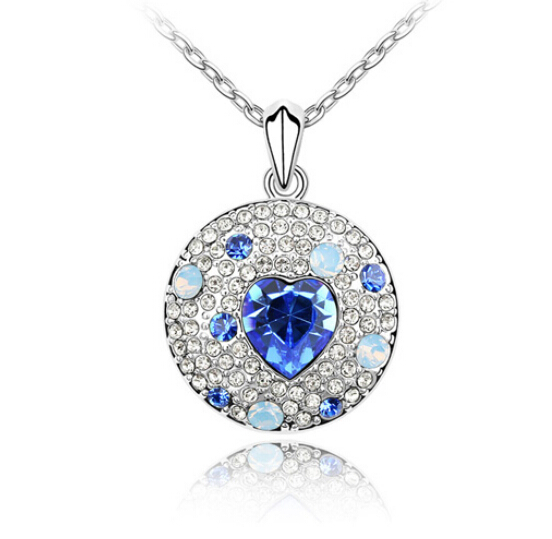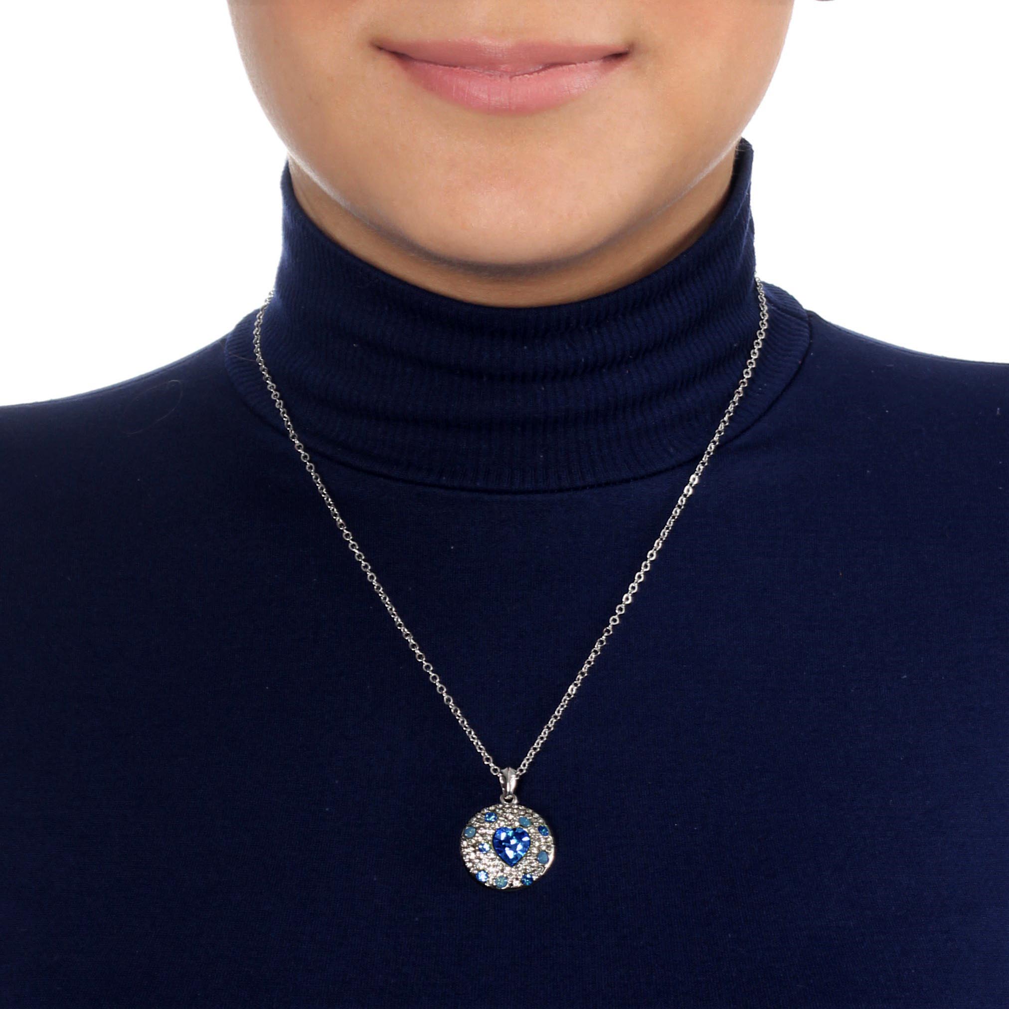 Dije con cadena en baño de oro blanco de 18 quilates, diseño de circulo con corazón de cristal azul e incrustaciones de cristales en color azul, tornasol y blanco. Fabricado en una estructura de aleación de platino con rodio sin níquel.