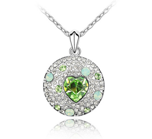 Dije con cadena en baño de oro blanco de 18 quilates, diseño de círculo con corazón de cristal verde e incrustaciones de cristales en color verde, tornasol y blanco. Fabricado en una estructura de aleación de platino con rodio sin níquel.