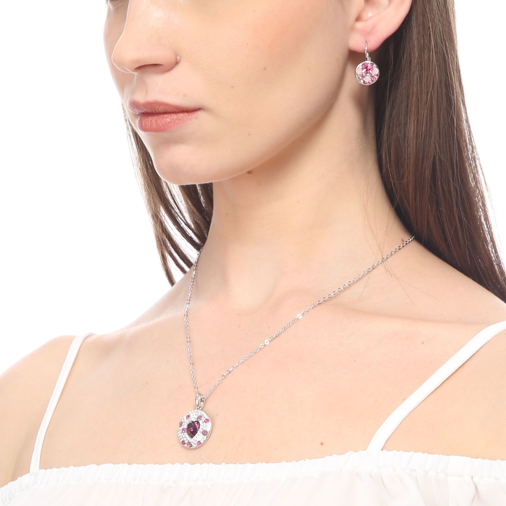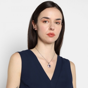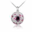 Dije con cadena en baño de oro blanco de 18 quilates, diseño de circulo con corazón de cristal morado e incrustaciones de cristales en color morado y blanco. Fabricado en una estructura de aleación de platino con rodio sin níquel.